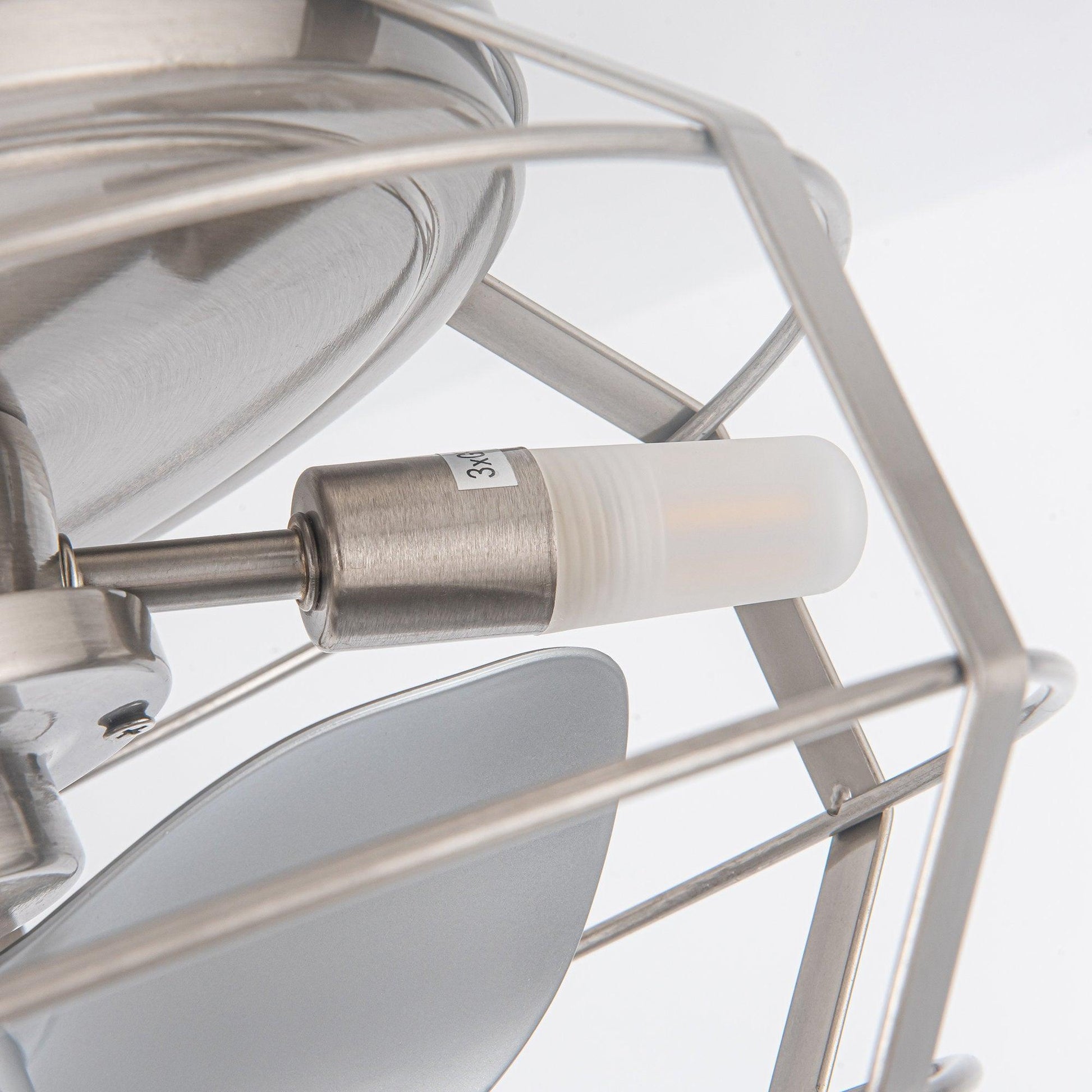 This sleek 12.2" Black/Satin Nickel Iron ceiling fan effortlessly infuses an industrial aesthetic into any room. Its minimalist, energy-efficient design not only enhances your home's style but also optimally illuminates your space with a low noise design for whisper-quiet operation. The fixture utilizes 3 G9 bulbs (included), with a maximum light power of approximately 2W. Additionally, it offers a color temperature of 2700K, perfectly catering to your daily lighting needs. This ceiling fan serves as an ideal finishing touch, adding a dash of sophistication to your ceiling.