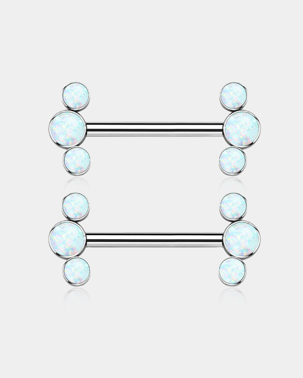 Both two charm ends in a gently curved design with three clear CZ/ white opal round accents detailing for extra sparkle. This bar is internally threaded.
