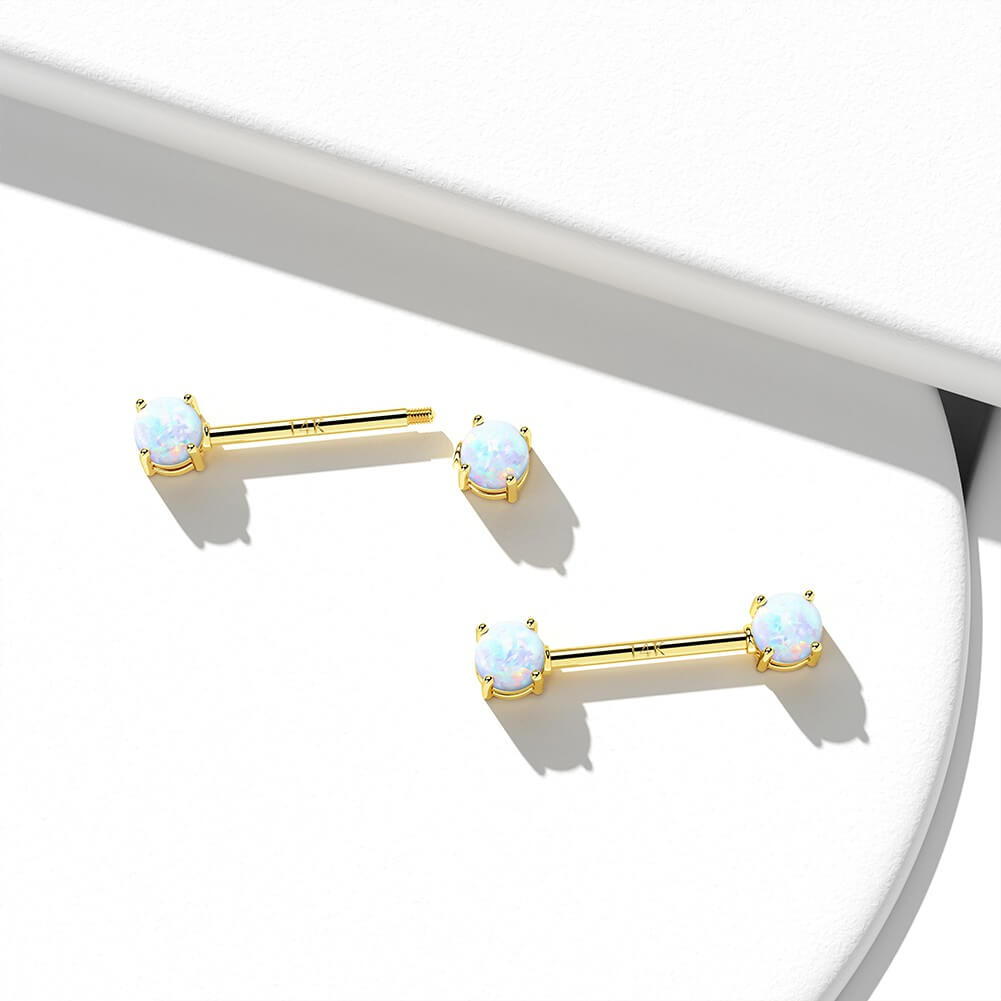 This pair of opal nipple rings are made of 14K solid gold, it is sold as a pair and there are opals on both ends.
