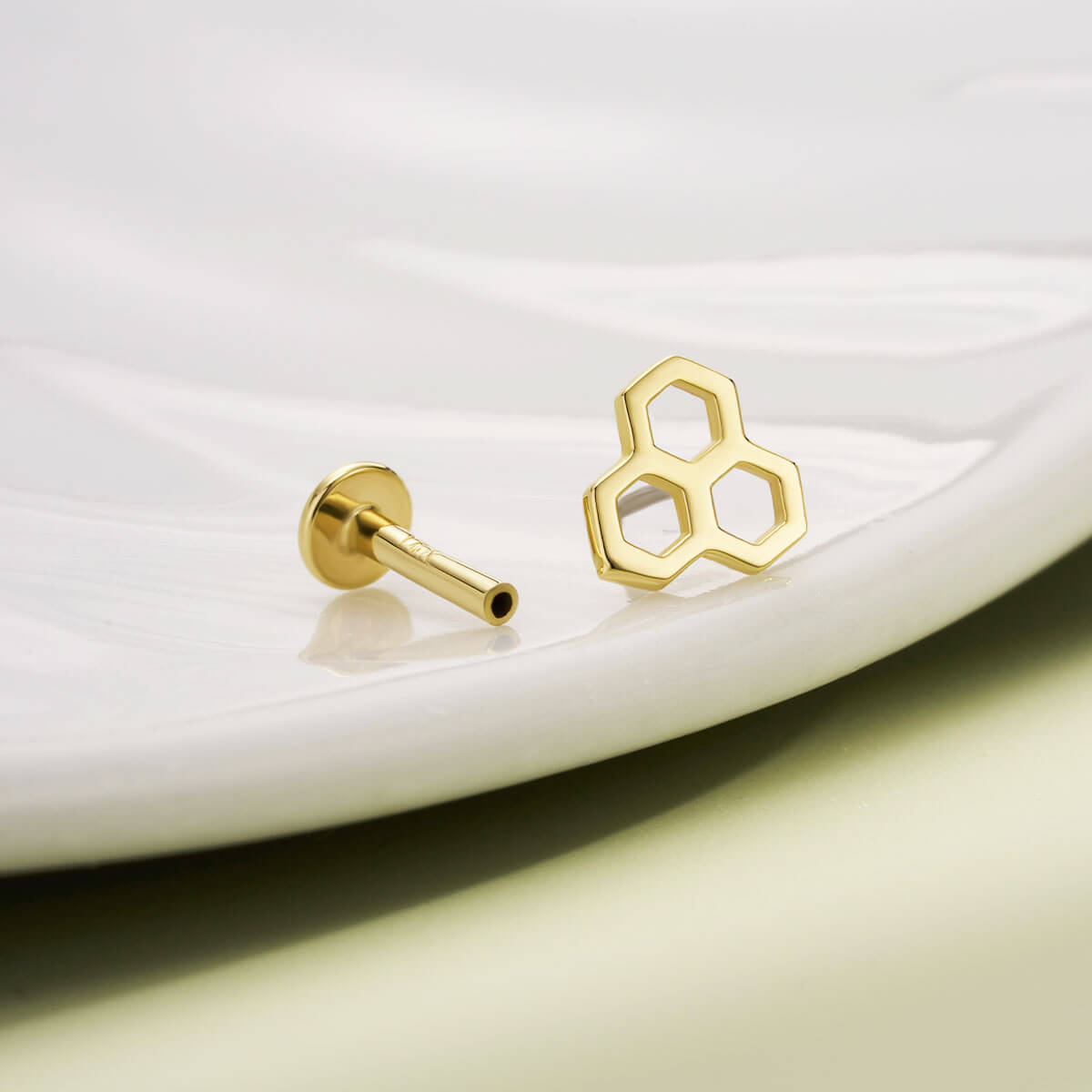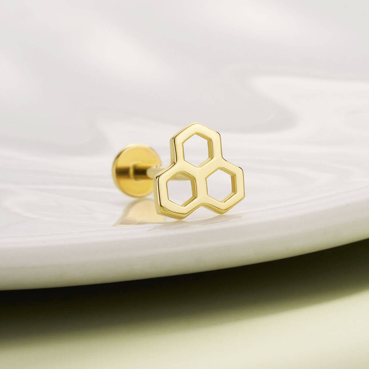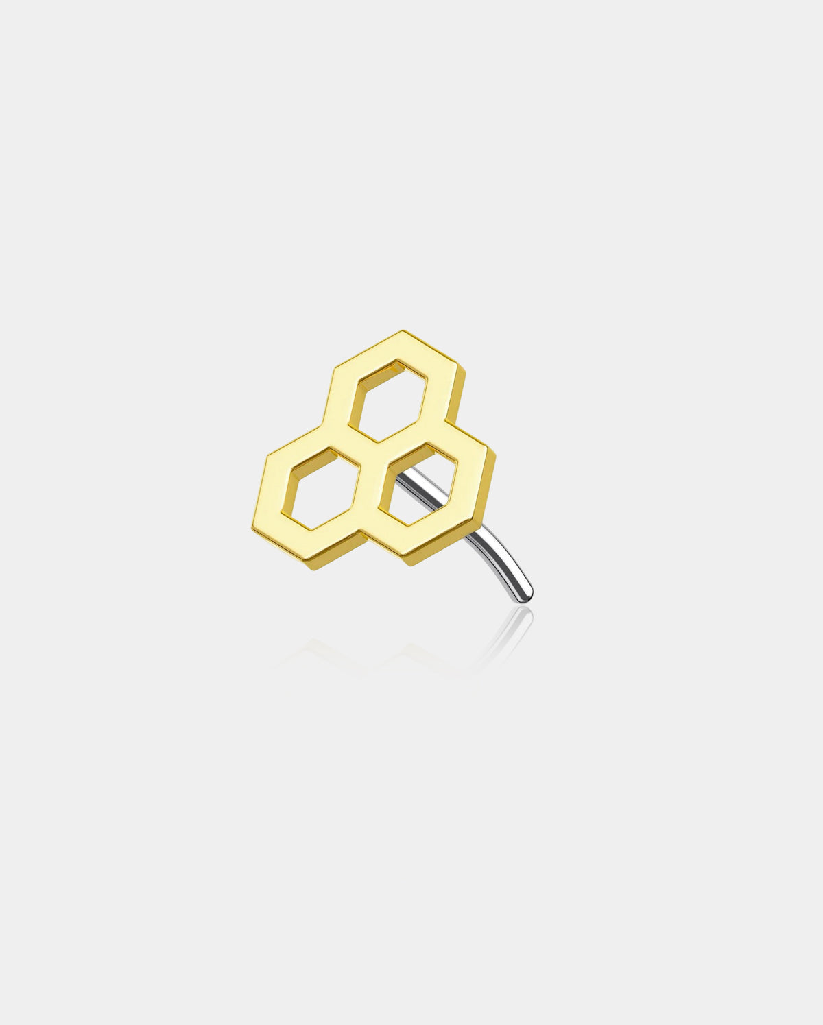 The flat surface of the honeycomb shape provides a sleek and minimalist appearance, allowing it to be easily paired with other earrings or nose rings. The honeycomb pattern adds a touch of depth and texture to the design, creating a visually appealing and stylish piece.