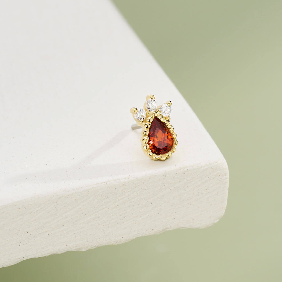 The striking marquise-cut cubic zirconia in a fiery red hue is set at the center, exuding a bold and captivating radiance. Its unique marquise shape elongates the appearance of the piercing, while the push pin mechanism ensures a secure and comfortable fit for all-day wear.