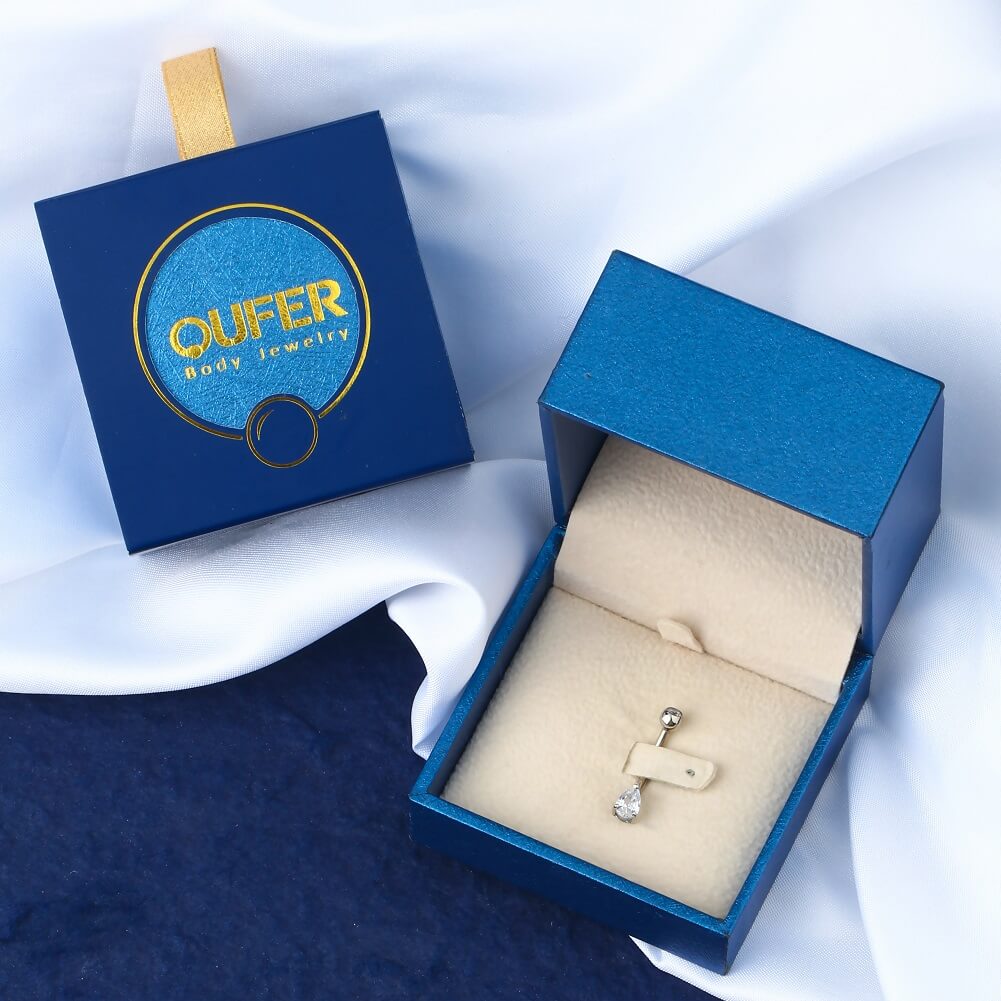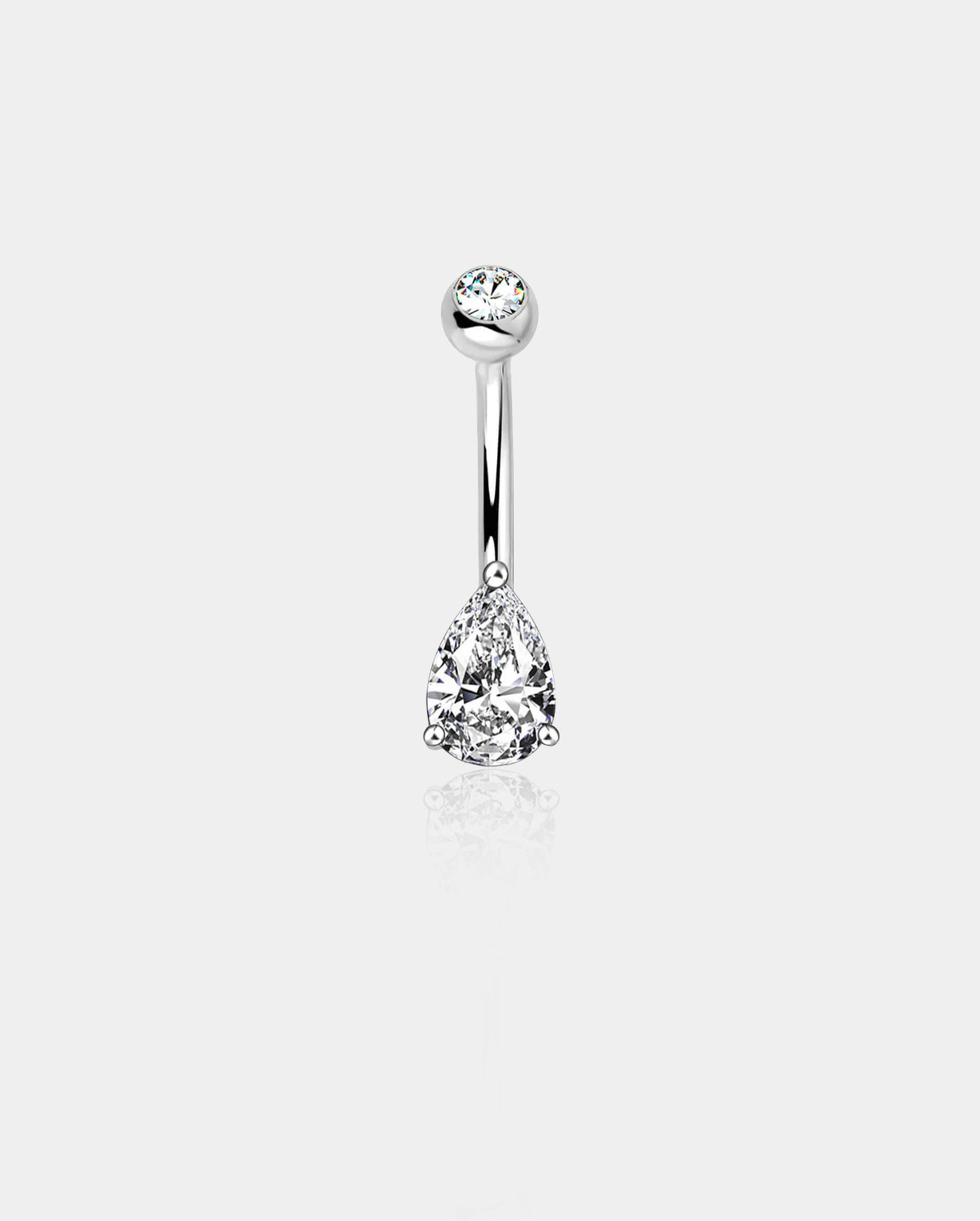 This elegant teardrop belly button ring evokes subtle femininity with a classic design featuring a 7 mm teardrop-shaped solitaire CZ in a prong setting and topped off with a glossy 5 mm white gold ball inside a clear Cubic Zircon. Bring you more praise.