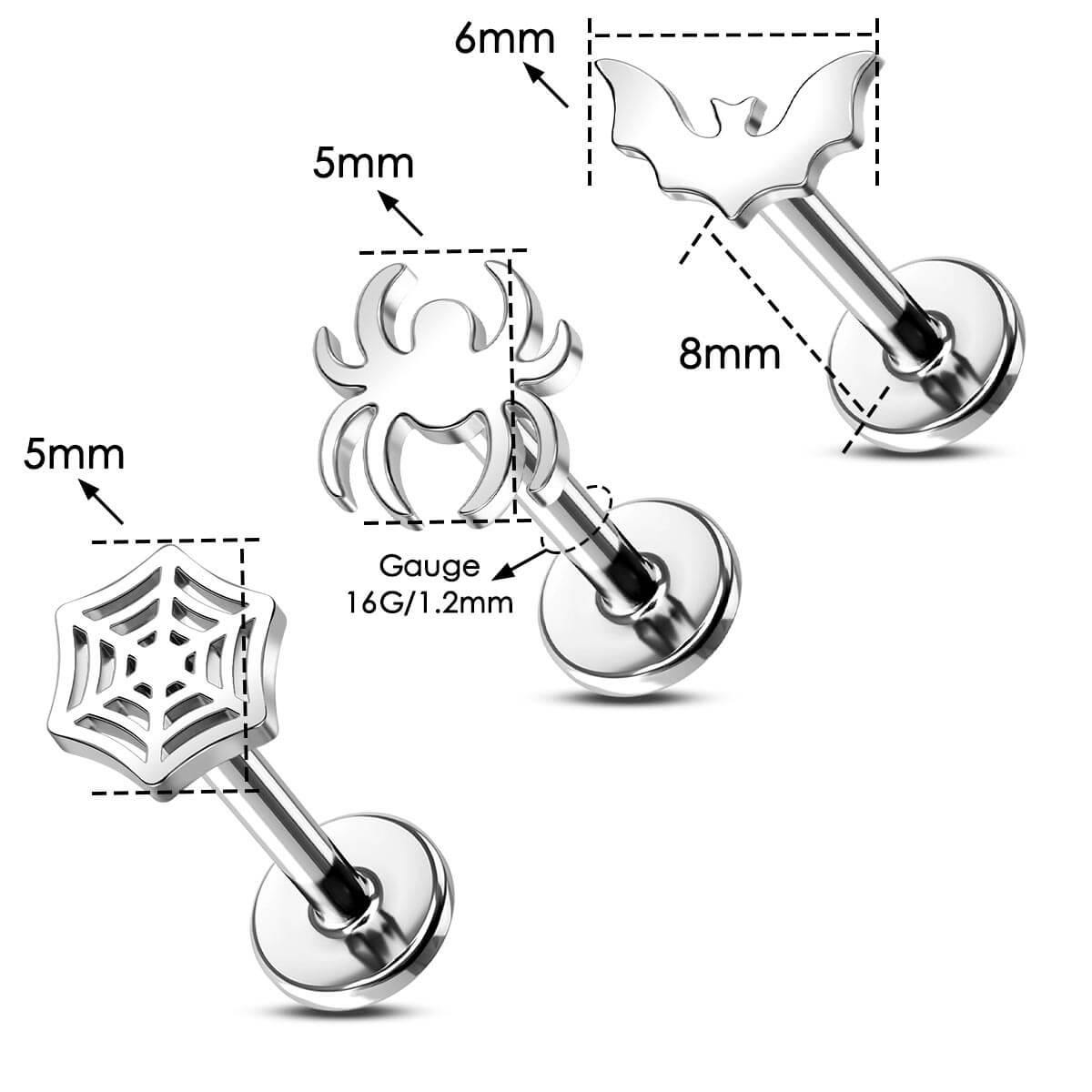 This Internally Threaded Halloween lip studs set is a striking and versatile collection designed for those who appreciate gothic-inspired jewelry. This set includes three distinct flat-top labret studs, each featuring a detailed design: a classic spider web, a sleek bat, and a crawling spider. Crafted from 316L stainless steel, these studs are internally threaded, ensuring a smooth and comfortable fit with a secure hold.