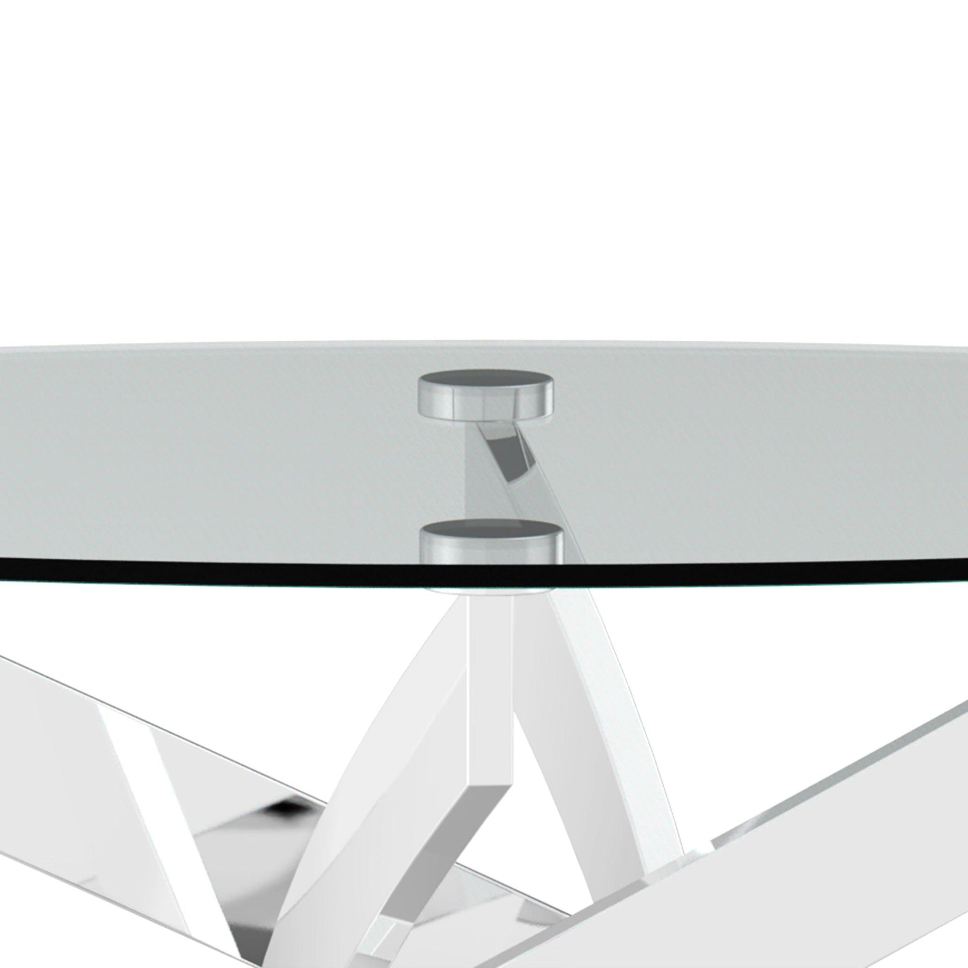 Modernize your living room with this table front and center. Chrome leg panels cross beneath the spacious table before splitting and rising up to the glass tops in sleek and distinctive contemporary design.