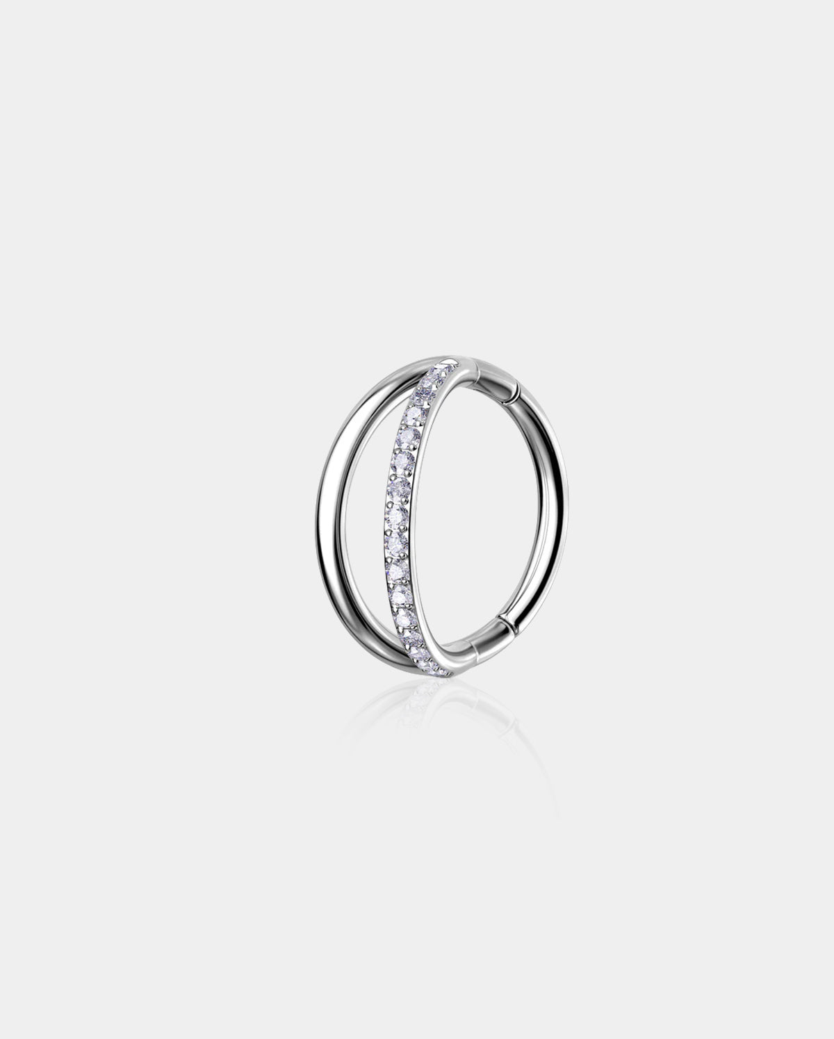 This is a chic and modern piece of nose hoop ring that adds a touch of sparkle to your look. Crafted from ASTM F-136 titanium, this nose ring features two interconnected hoops, with one adorned with a row of dazzling cubic zirconia stones. The half-circle design creates a bold yet elegant aesthetic, while the high-quality CZ stones provide a subtle but eye-catching shine.