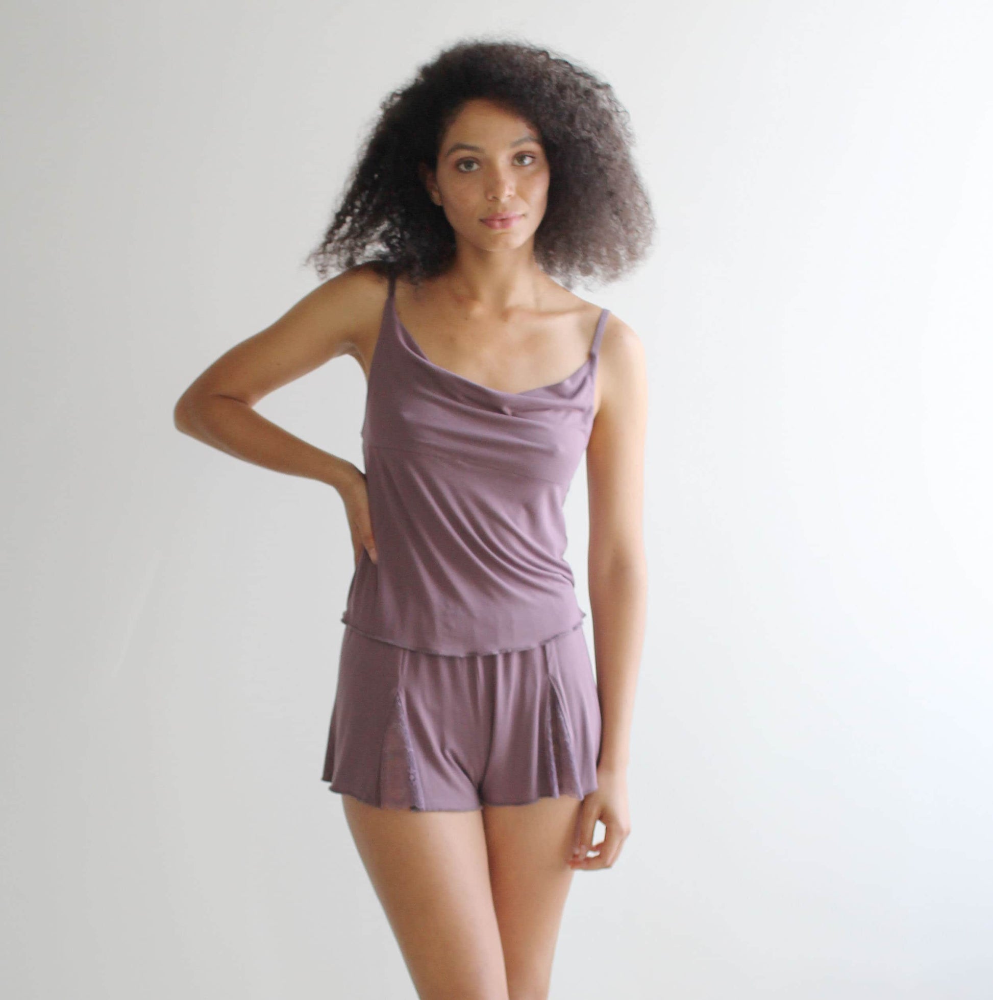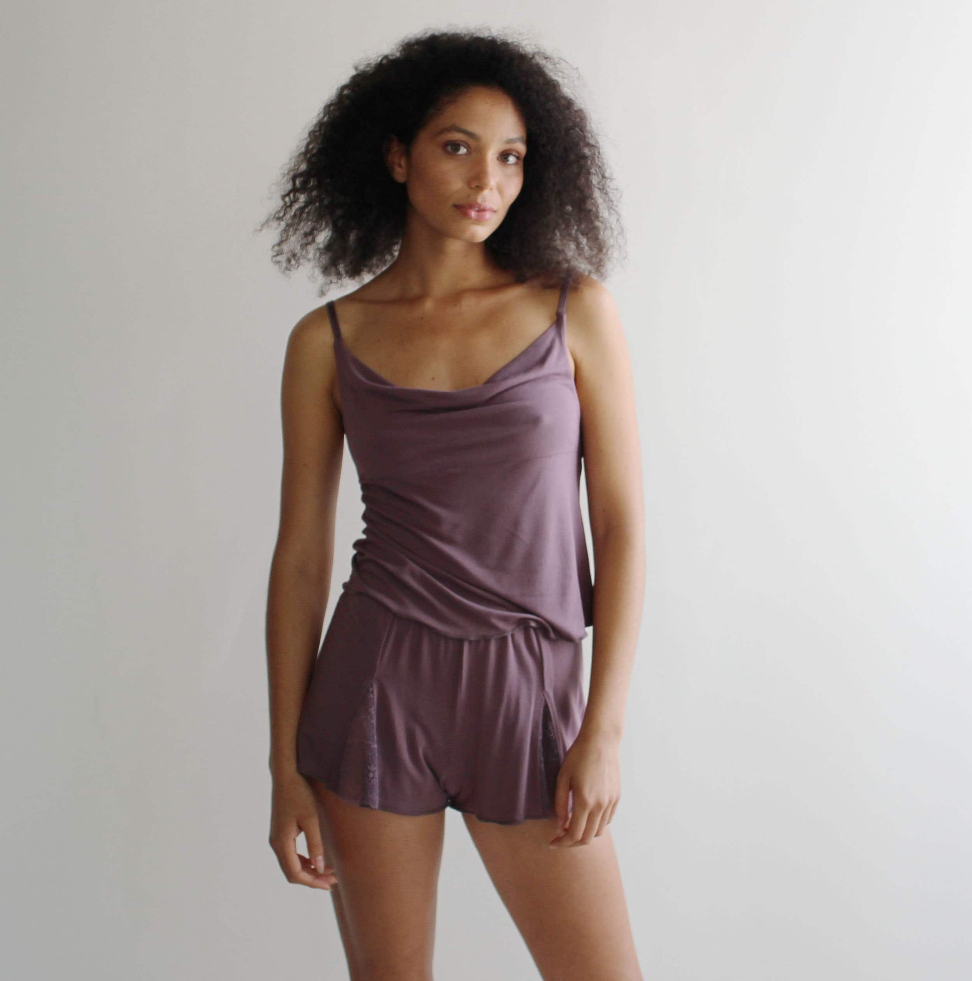 A two piece lingerie pajama set including the draped neck camisole and the lace trimmed boxer shorts