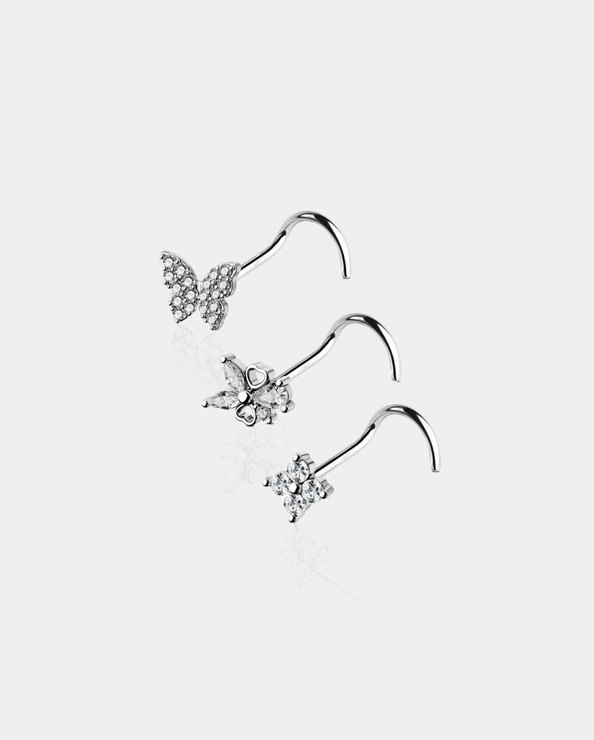 This nose stud set includes 3 pieces, a butterfly, a flower, and a designed-type small butterfly, they are all mosaicked with CZ gems, shiny and gorgeous.