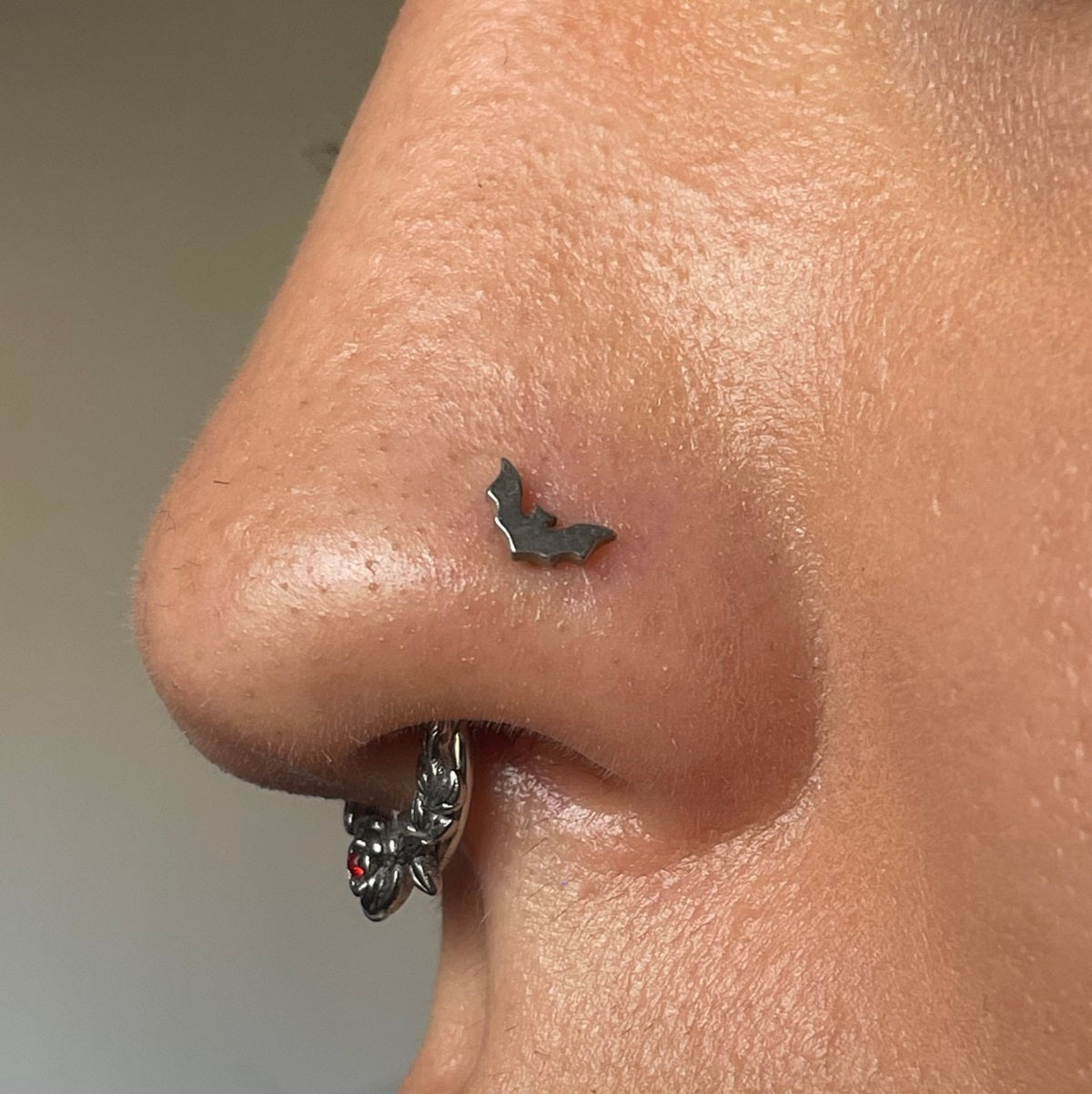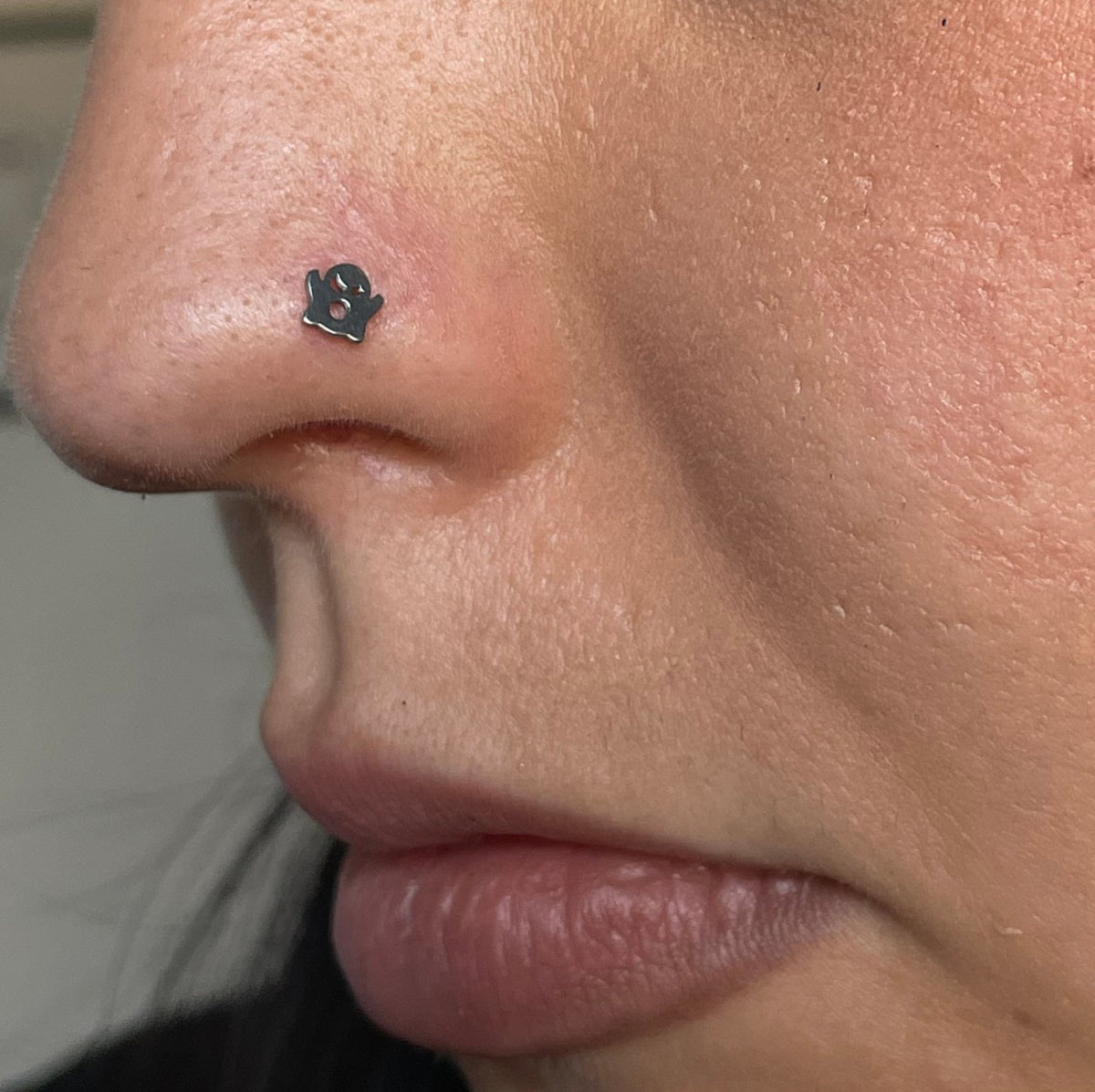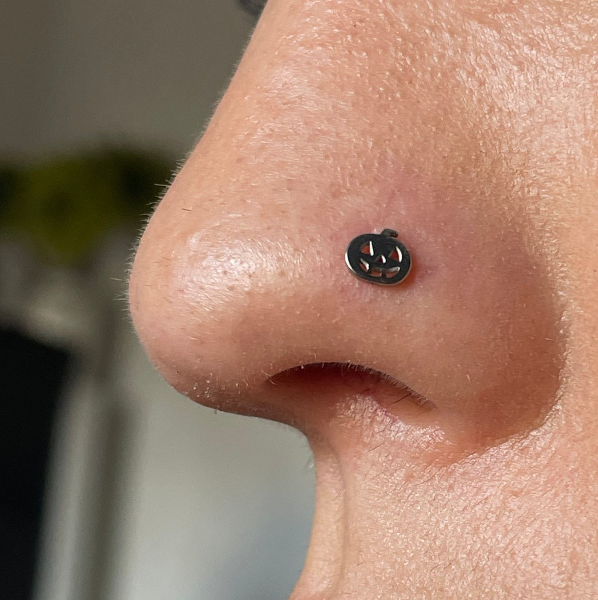 This Halloween nose studs set is a playful and festive collection perfect for adding a touch of Halloween spirit to your style. This set features three L-shaped nostril studs, each with a flat, detailed charm: a friendly ghost, a sleek bat, and a cheerful pumpkin. Whether you're getting into the Halloween mood or simply love whimsical accessories, this set brings a charmingly eerie vibe to your nostril piercing.