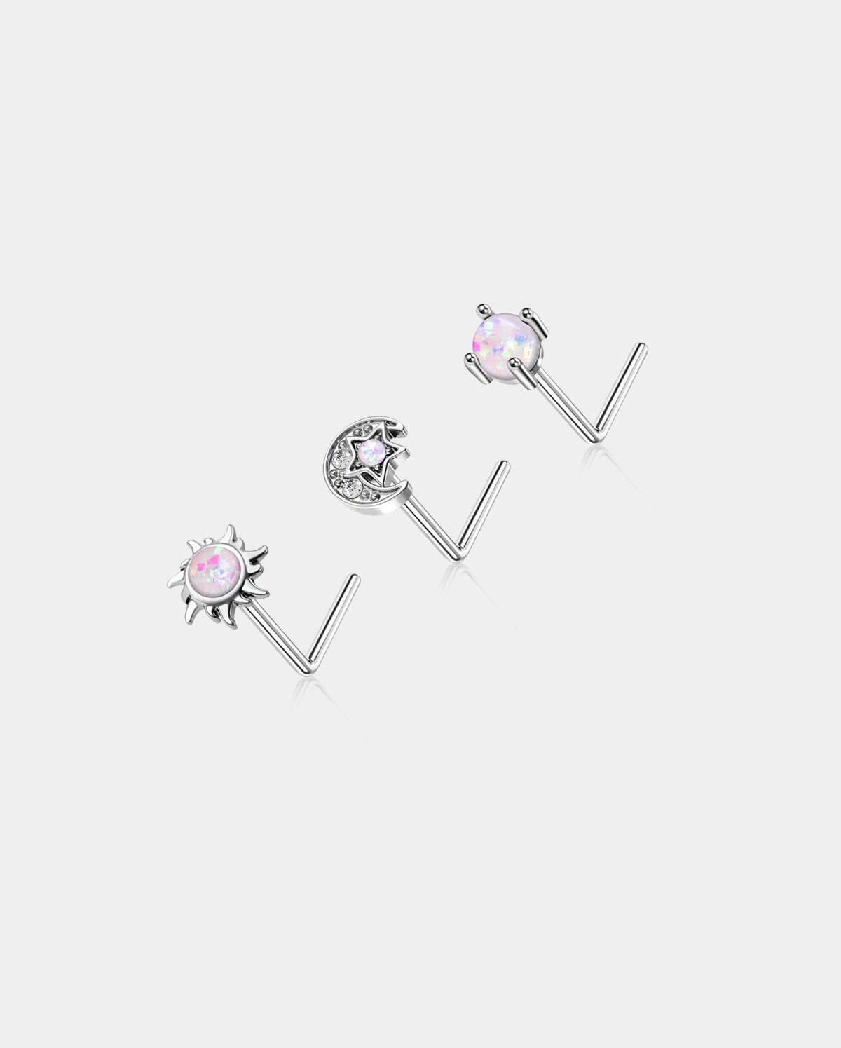 Choose between three captivating designs: a crescent moon, a shining planet, or a delicate sunflower, all thoughtfully crafted to bring a unique, playful charm to your nose piercing. Whether drawn to celestial vibes or floral elegance, these L-shaped opal sun and moon nose studs add personality and sparkle to any look.
