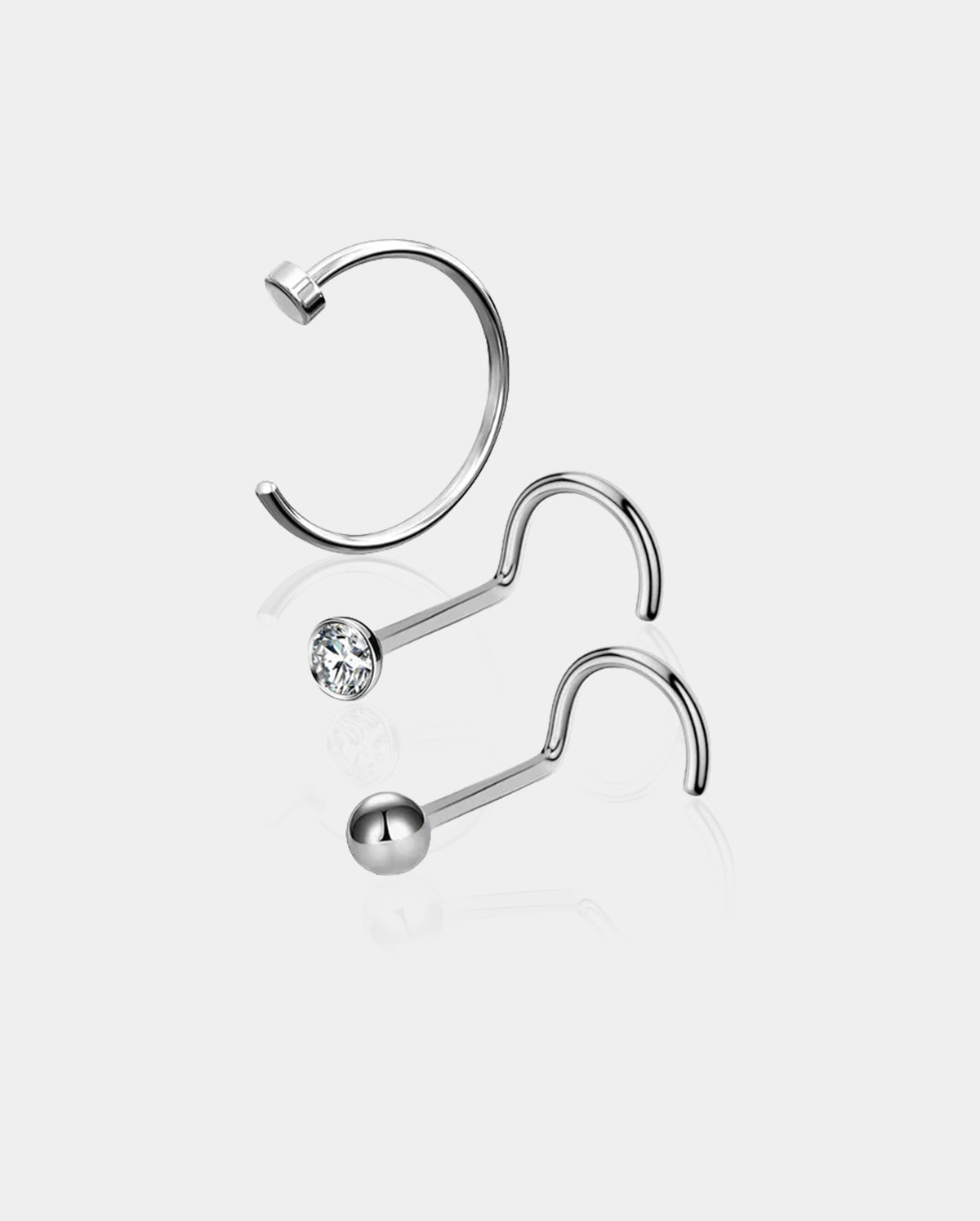 This pack is made of ASTM F136 titanium, the best material for fresh piercing and sensitive skin, includes 3 pcs different types of nose jewelry, an 8mm half ring, a 2.5mm clear tiny CZ press-fit end nose screw, and a 2.5mm top metal ball nose screw.