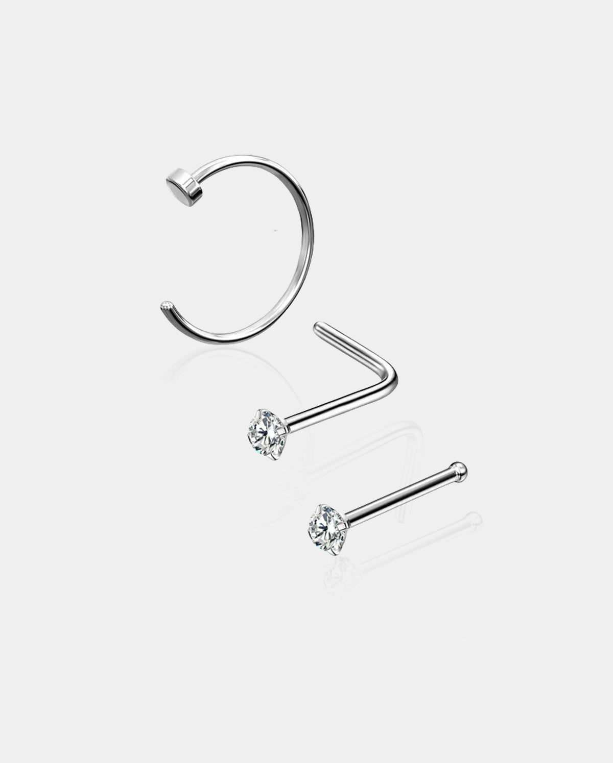 This titanium nose piercings ring pack includes 3 pieces, a C-shape nose hoop, an L-shape CZ nose stud, and a classic straight bar nose stud with a CZ on top.