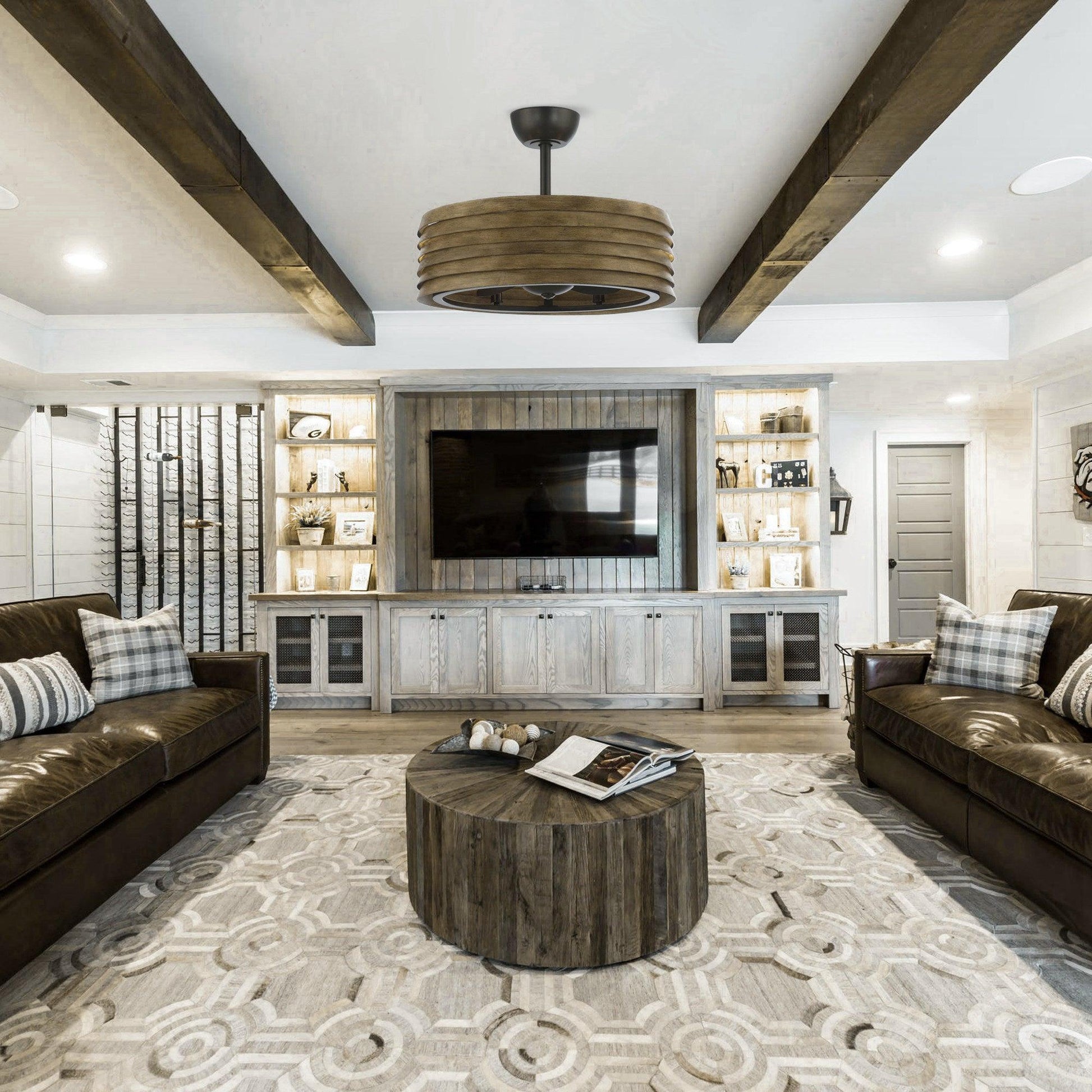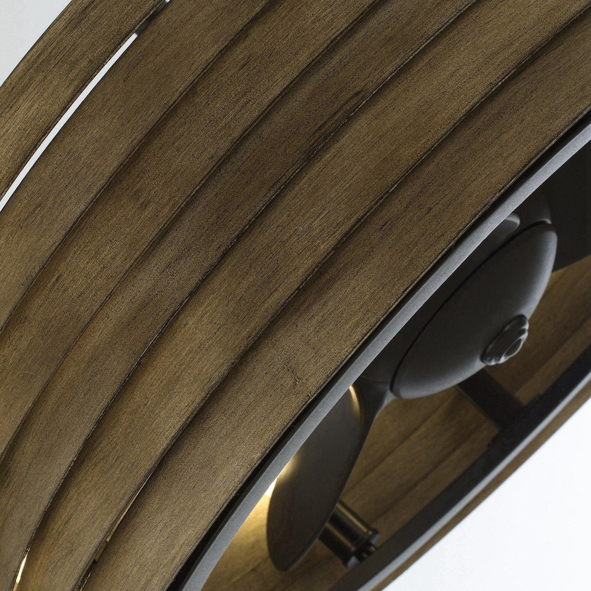 This caged fan with sand black + imitation veneer gradient throughout the body adopts a special process to bring a retro texture. This 24" ceiling fan features a cleverly decorated cage design. Comes with six Edison bulbs (not included).