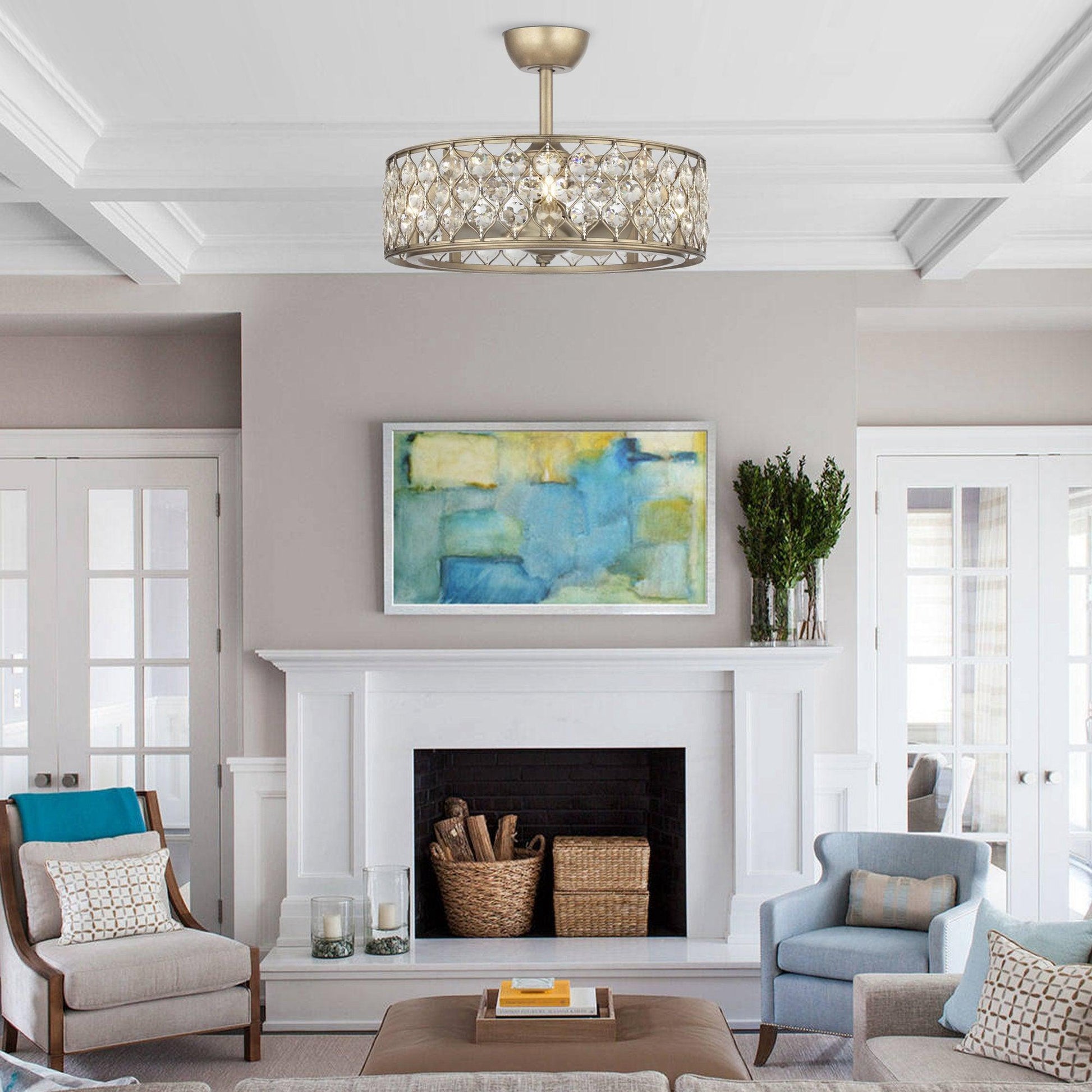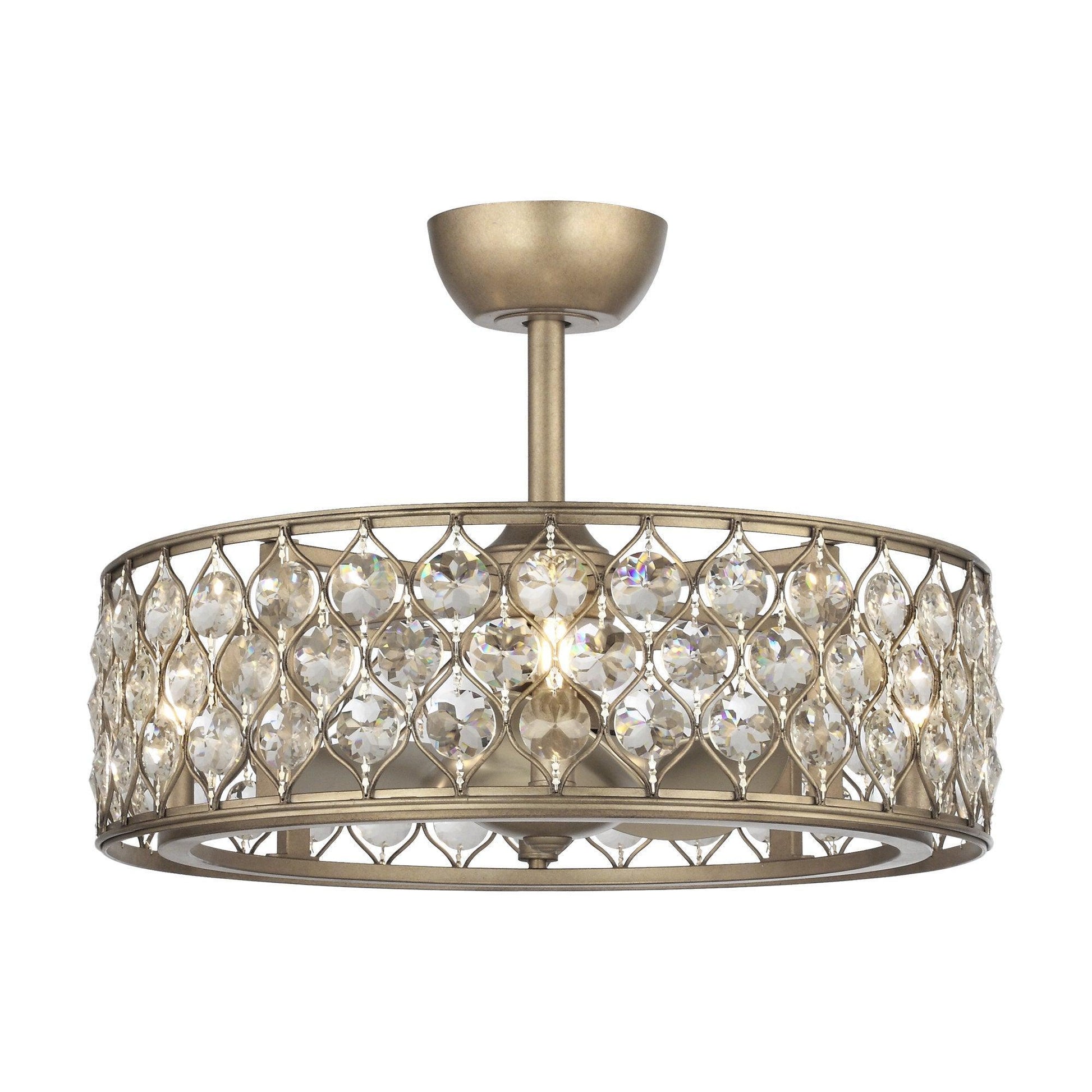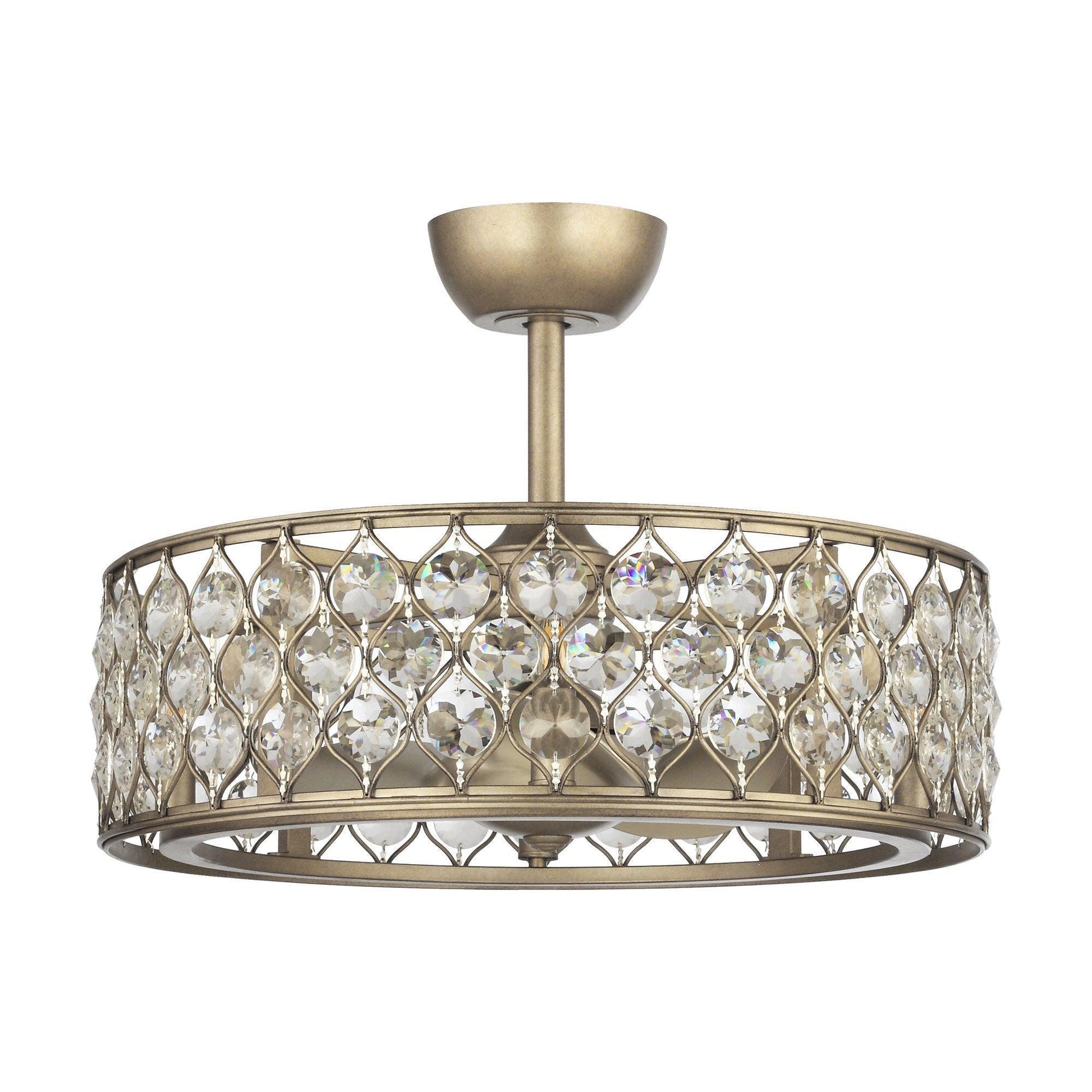 25" | Iron, Crystal | L8"&L20" | 3*Reversible ABS Blades | 4*E12 Lamp holders no bulbs | DC motor | 720RPM | Remote control | Yes | Dry location |