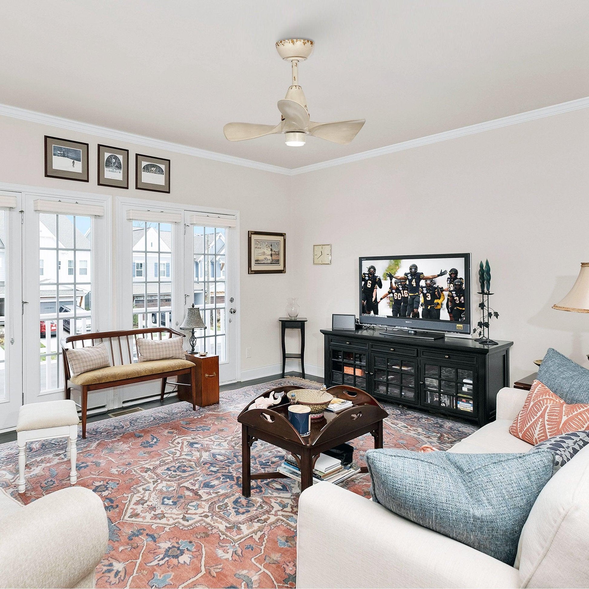 The Kwang 28 in. ceiling fan is manufactured with the latest technology. With 3 exceptionally wooden/white/beige finish blades, add a touch of elegant modernity. Three ABS blades finished in walnut/white/beige are paired with a matte black/white/beige finish motor, creating a cohesive look and feel. It includes a handheld fully functional remote system offering 5 speeds, reverse direction, and a timer. The light source is an integrated 11-Watt LED that is energy-efficient and long-lasting. It is small but powerful, superior in both looking and functions.