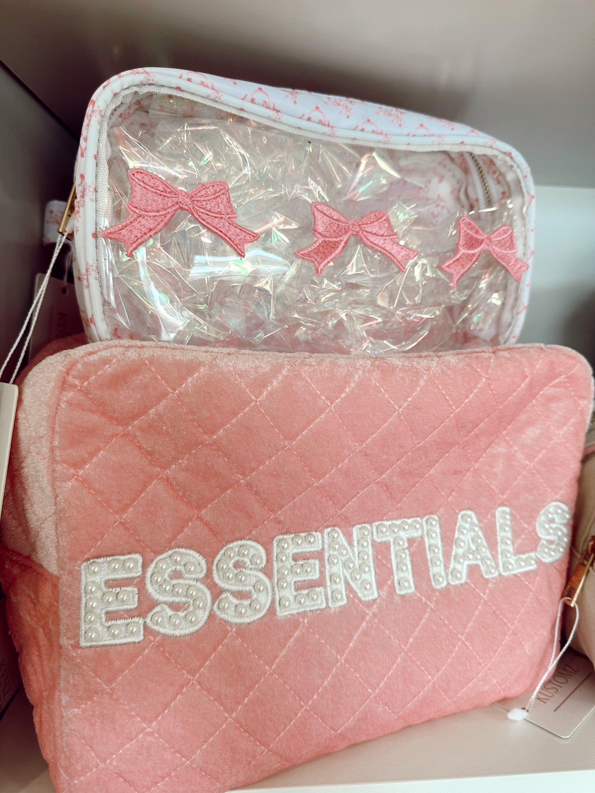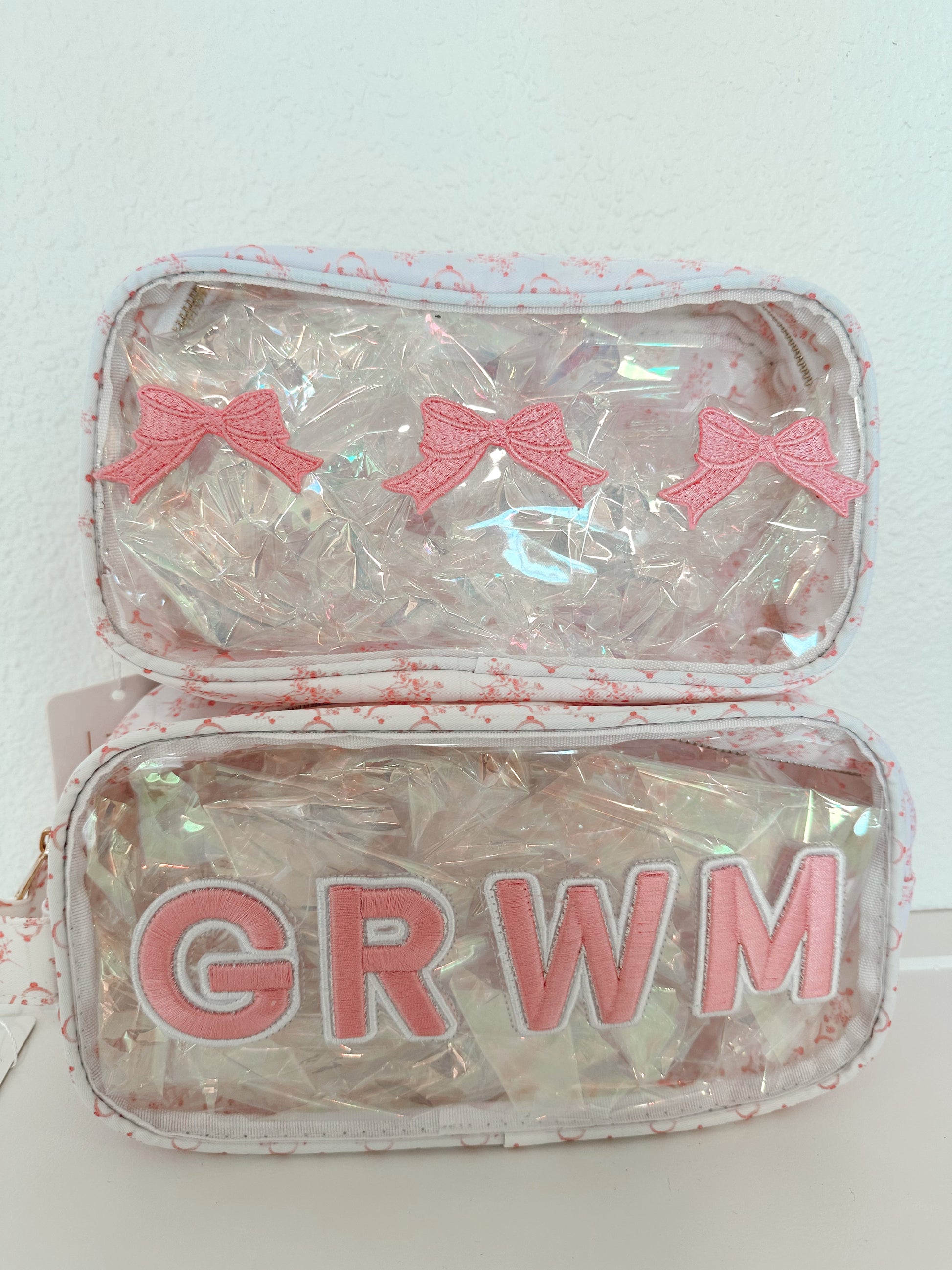 - Clear one one side with pink bow patches sewn on