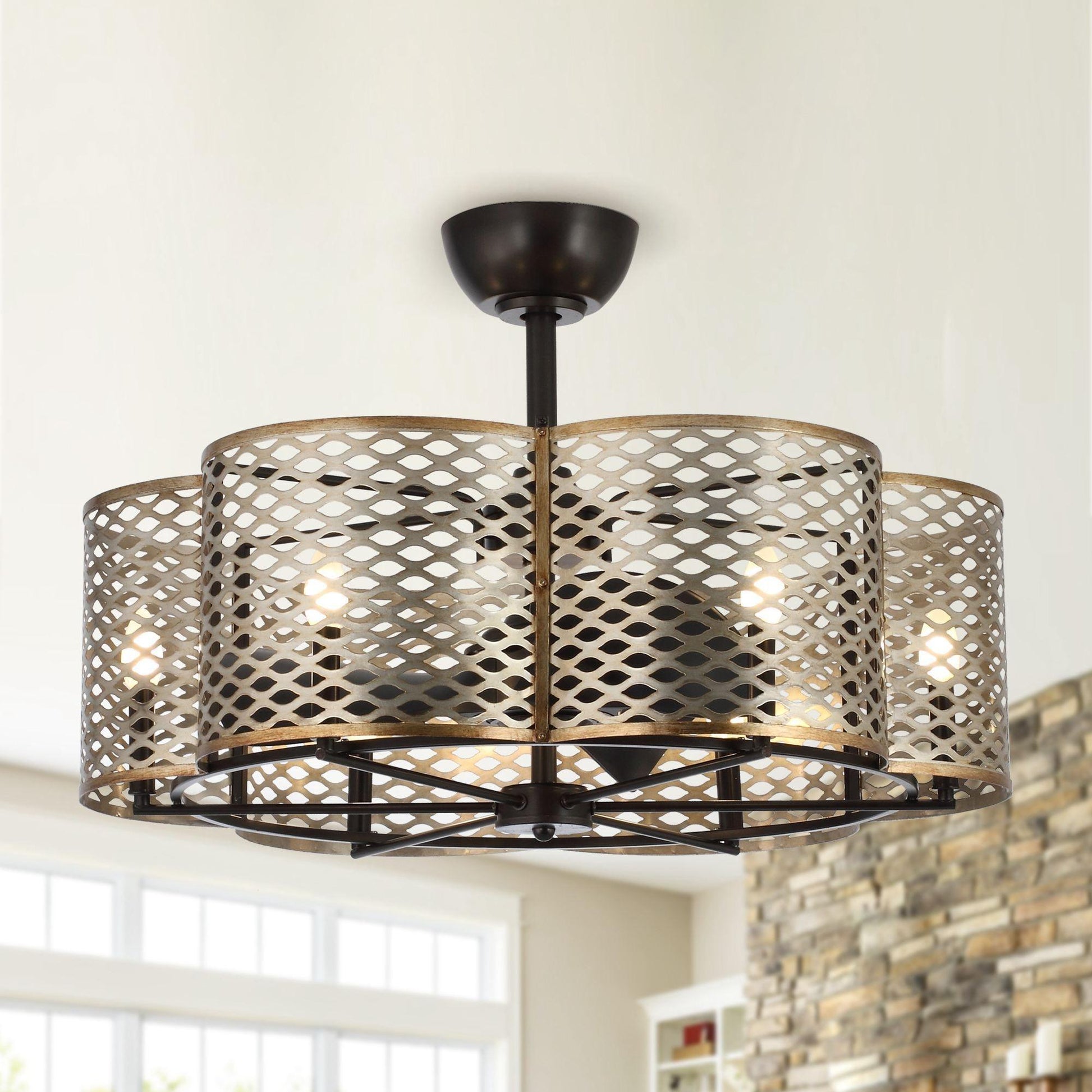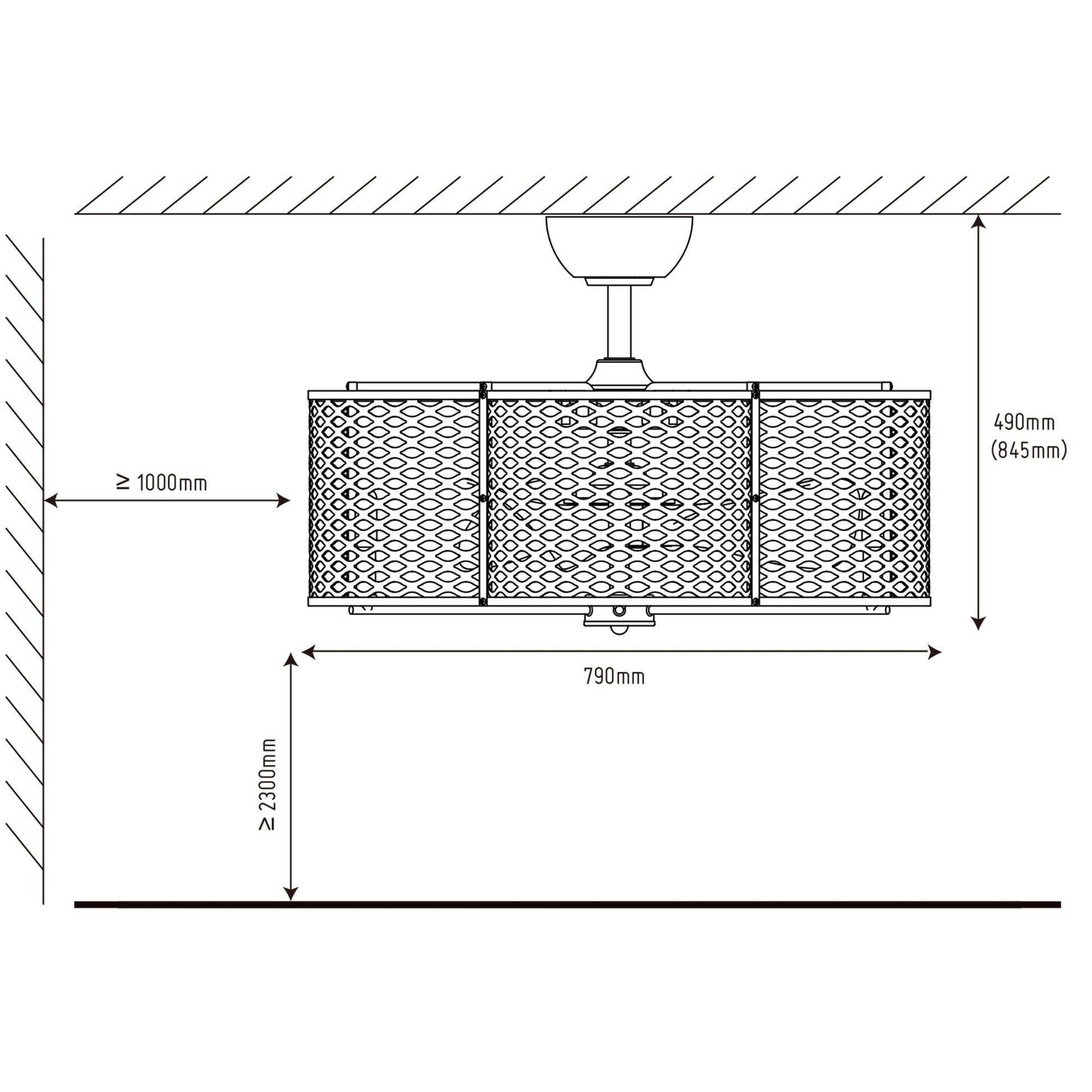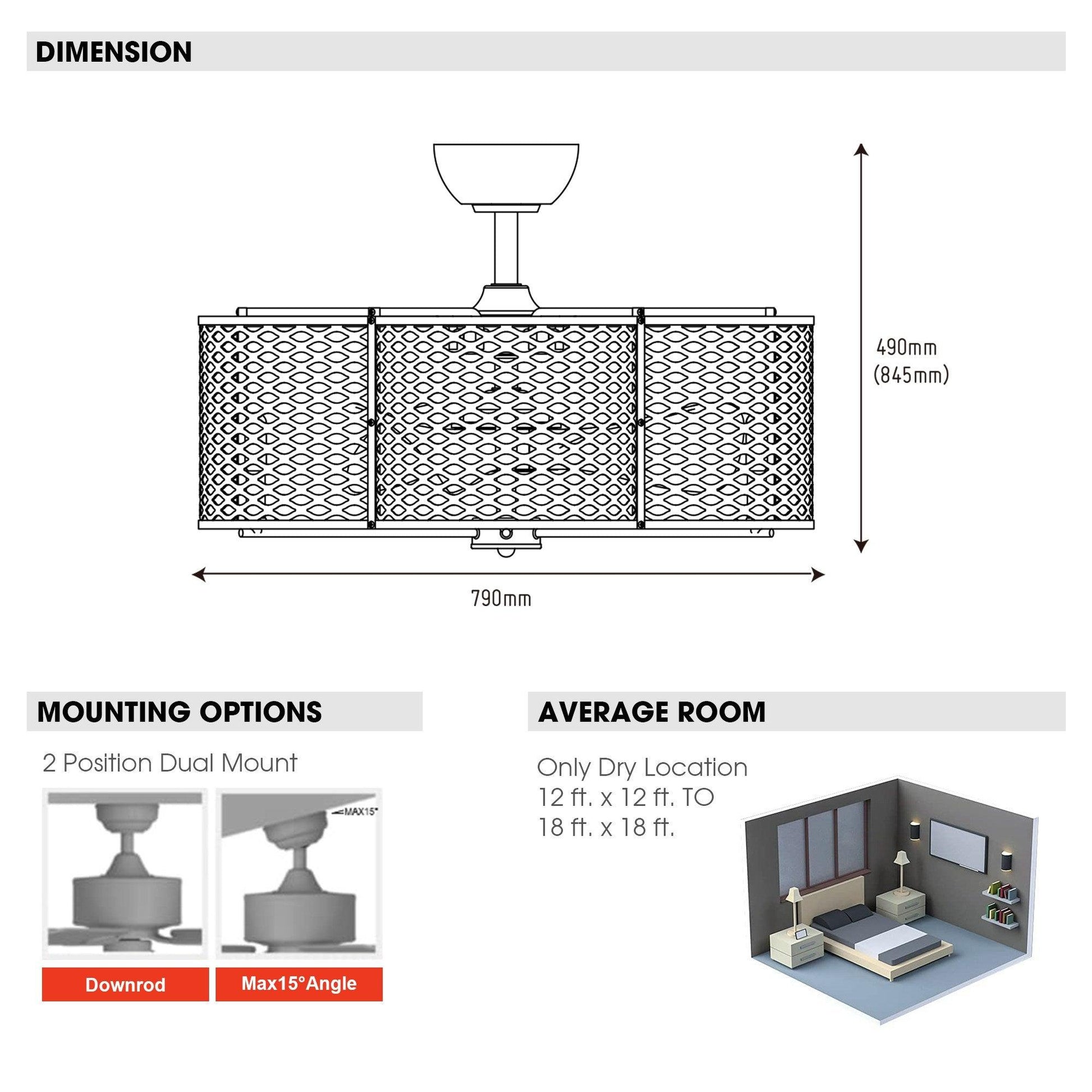 31” | Iron | D1"-L6" | 3*ABS Blades | 6*E12 Lamp holders no bulbs | DC motor | Remote control | 6 | Dry location |