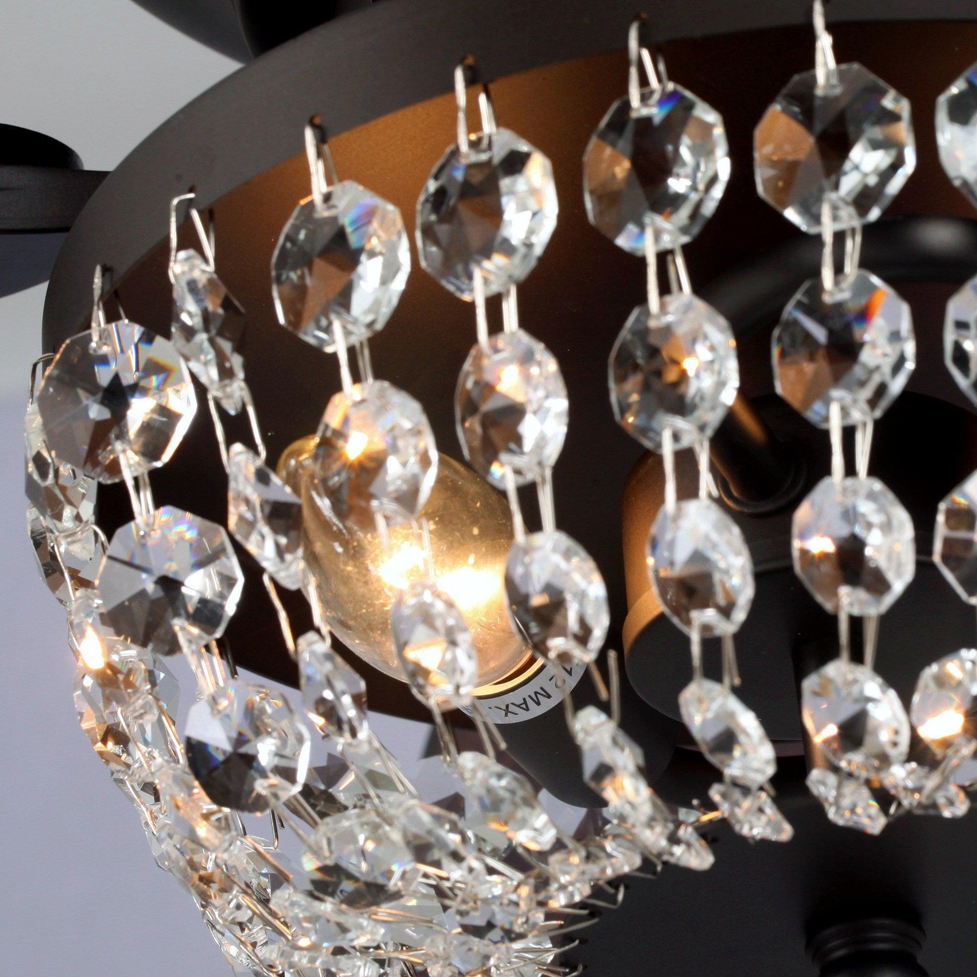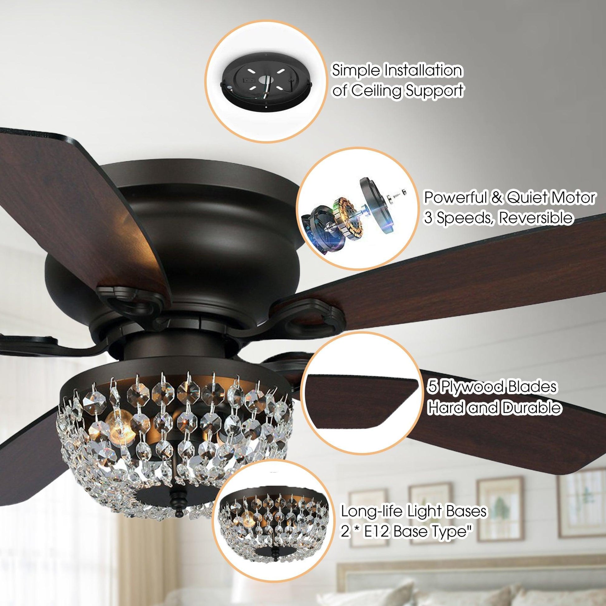 Keeping cool doesn't mean you have to sacrifice style: This flush mount ceiling fan brings glay up to your ceiling The coolest part isn't its blades, but the crystal shade that surrounds 2-bulbs apiece for an eye-catching glow. With the lights, there are 5 satin Nickel finished wood blades that have 3 speeds. This fan and lighting kit must be hardwired and installed by a qualified electrician.