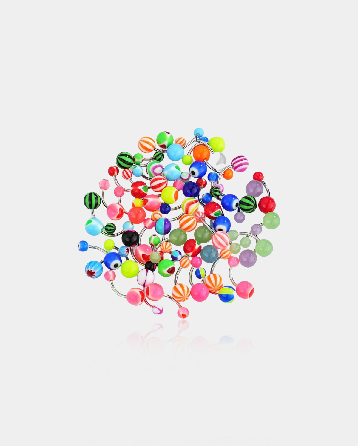 This value-packed set includes 50 colorful and lightweight belly button rings, made from high-quality, hypoallergenic acrylic ends, and 316L stainless steel curved barbell for comfort and durability.