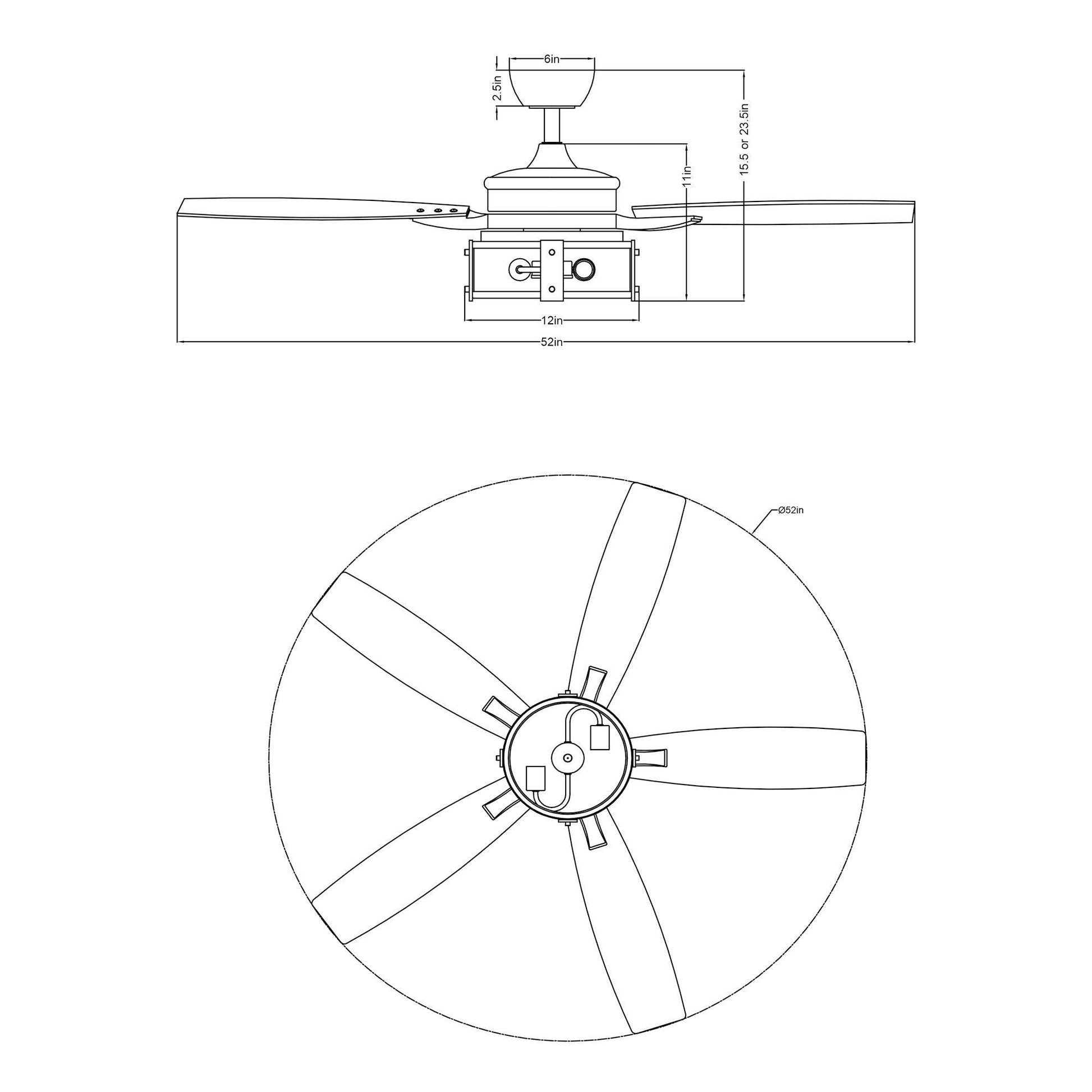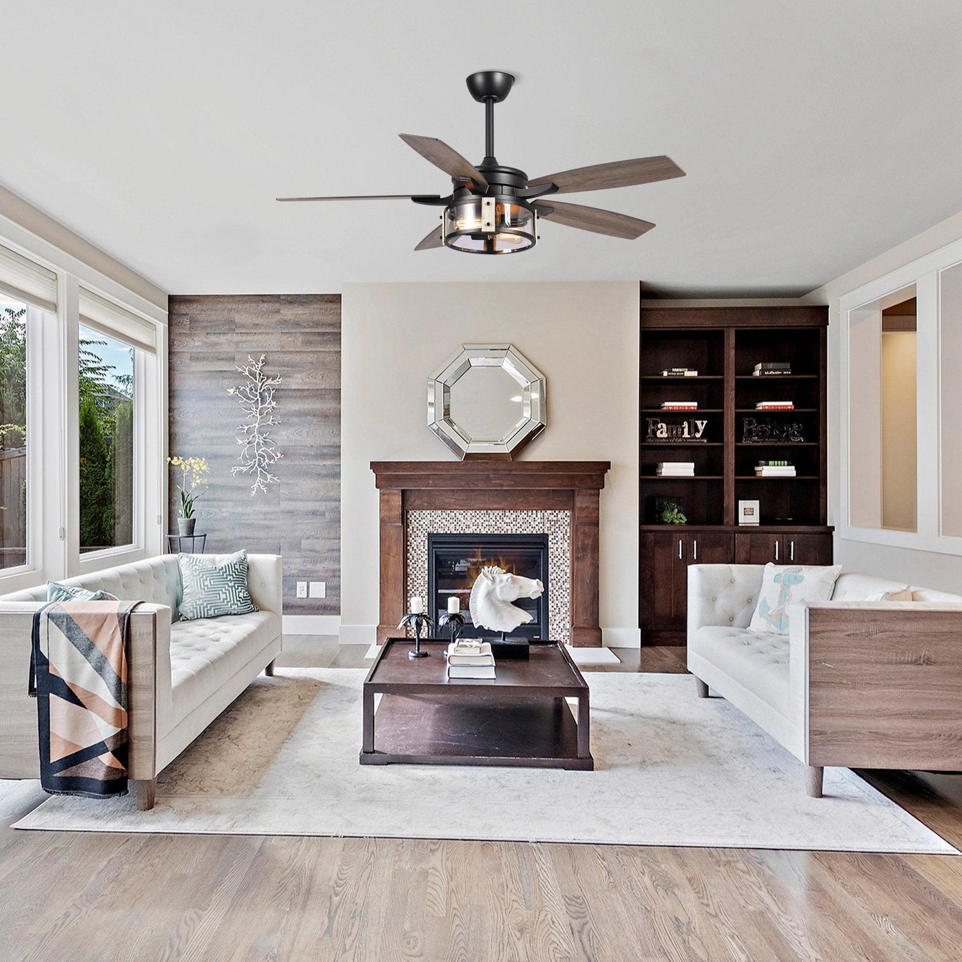 52” | Iron, Plywood, Glass | D1"-L4"&L10" | 5*wooden Blades | 2*E26 Lamp holders no bulbs | AC motor | Remote control | 3 | Dry location |
