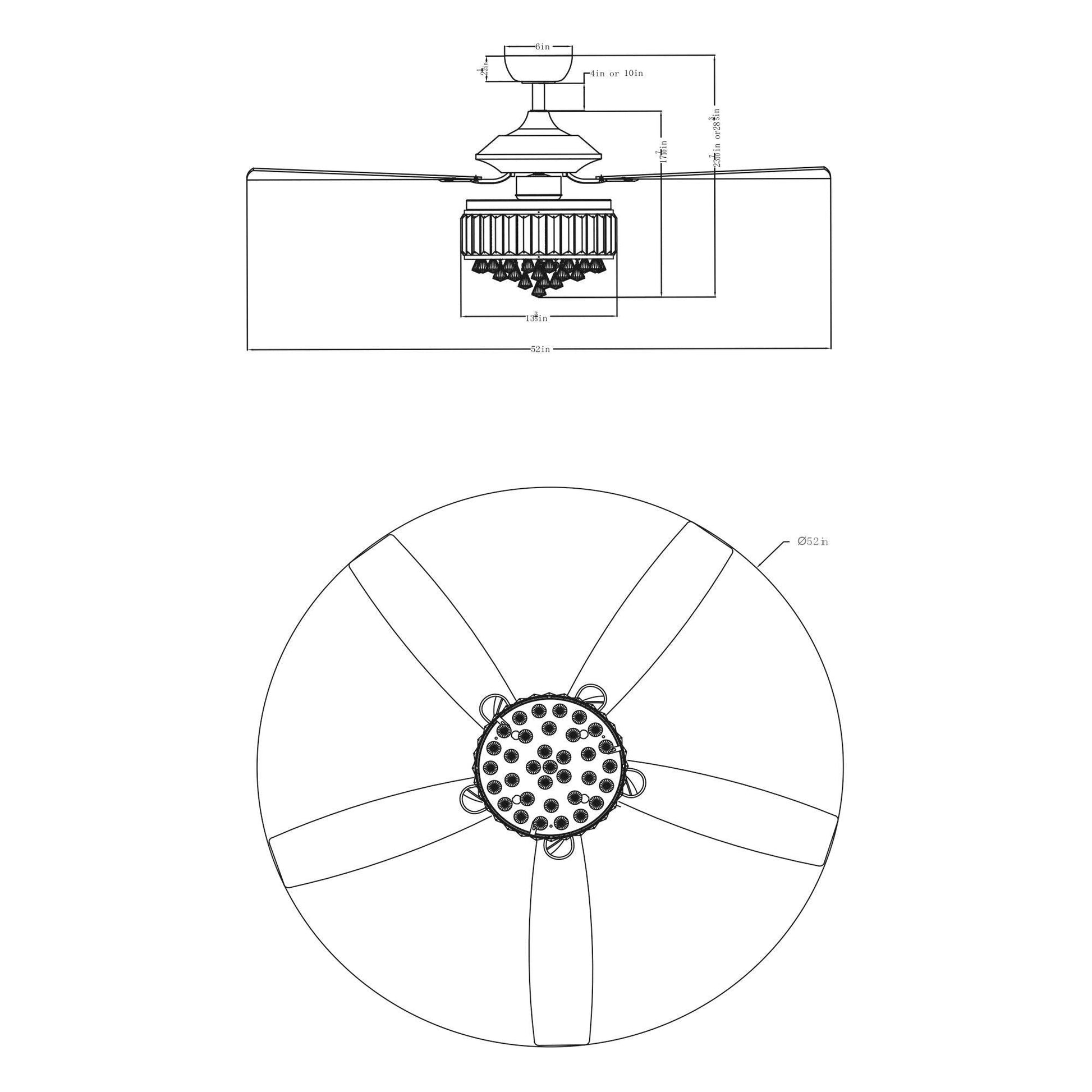 52” | Iron, Plywood, Crystal | L4"&L10" | 5*Plywood Blades | 4x25W, E12 base light bulb(not included) | AC motor | Remote control | 3 | Dry location |