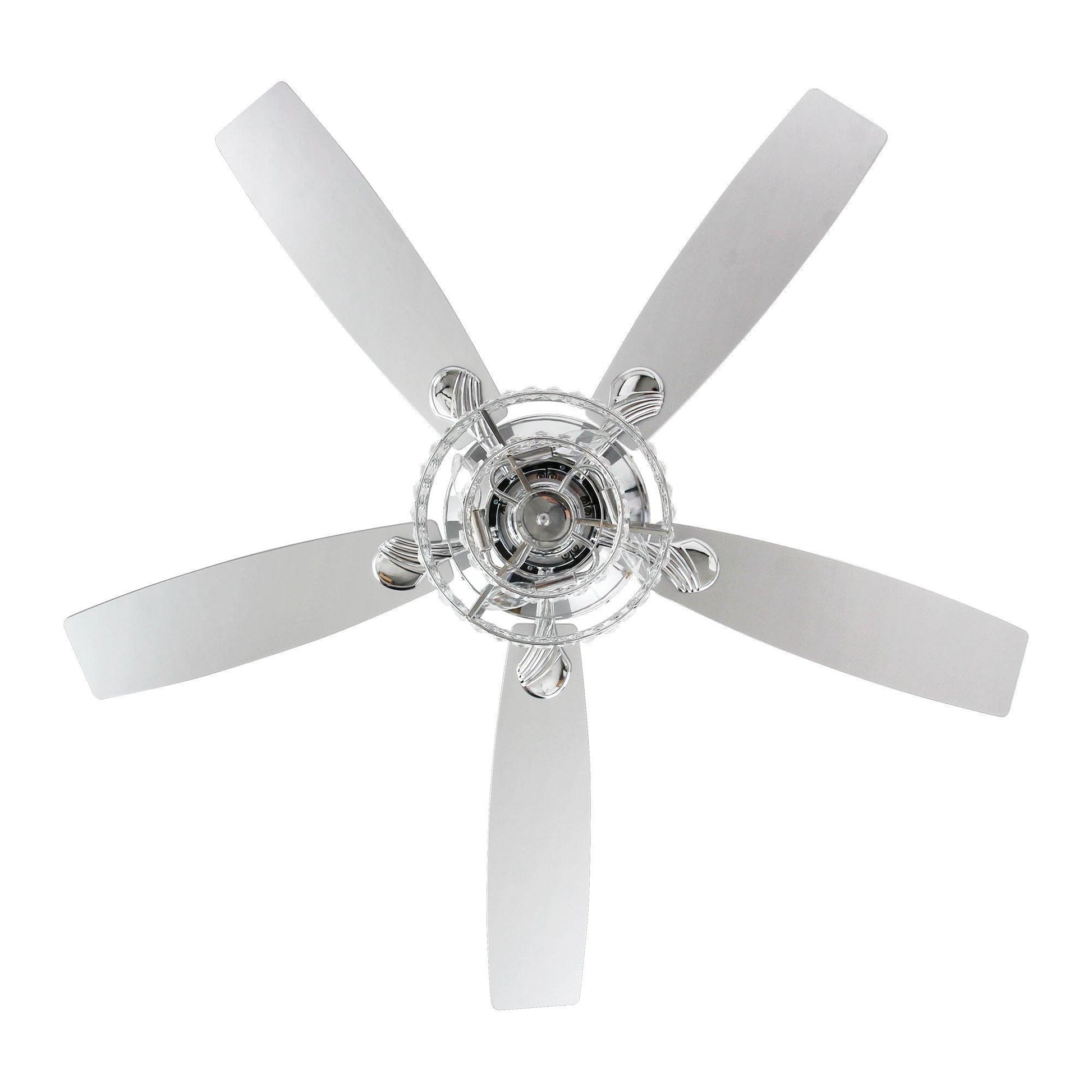 Beautiful crystal chandelier ceiling fan with lights work with high-quality mechanical elements coalesces into an elegant lighted ceiling fan. The shade is two-tiered with crystal-embedded stamped metal walls. The richly traditional design is meant to complement any luxurious space.