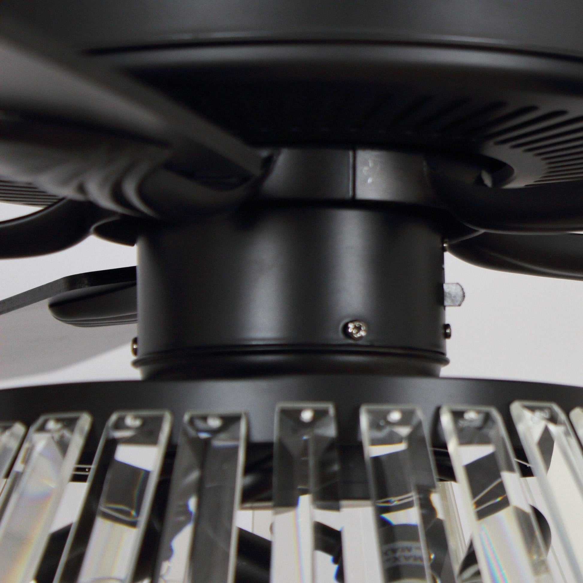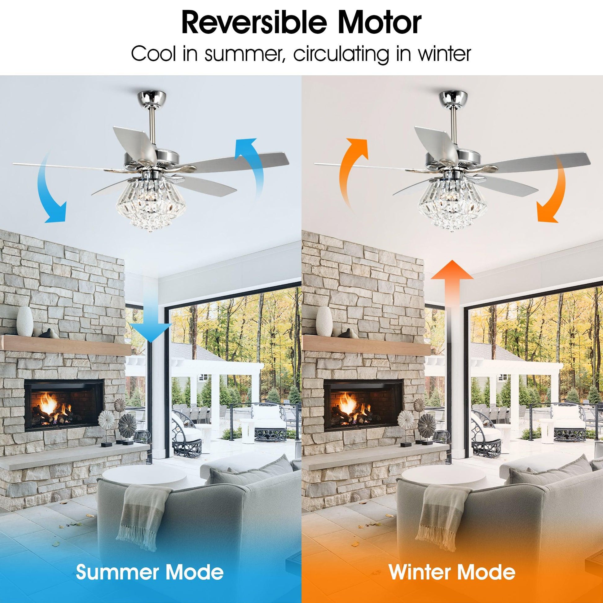 These crystal chandelier ceiling fans with lights are the most cost-efficient option for bringing the temperature down and moving stale air out of your room. This lighted chandelier ceiling fan is the perfect solution for your cooling and lighting needs. A full crystal shade combines to fill your home with a grandeur rarely found in such a functional package. The matching silver-stained wooden blades move an impressive amount of air. The 3-speed motor ensures you find the exact setting for your stimulating comfort.