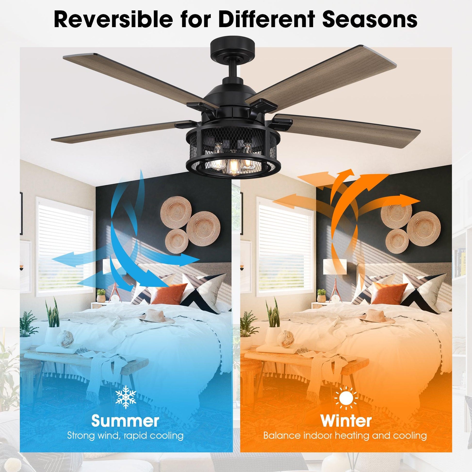 Enjoy this Industrial reversible 5-blade mesh LED ceiling fan with a beautiful matte black/gold/silver finish motor and five matching reversible color blades. The three-speed motor allows you to circulate cool air or heat year-round. Three lights within a metal mesh shade create a wonderful ambiance for any home office, living room, or bedroom space. Add stylish industrial style to your living space with this 52-inch ceiling fan from Parrot Uncle.