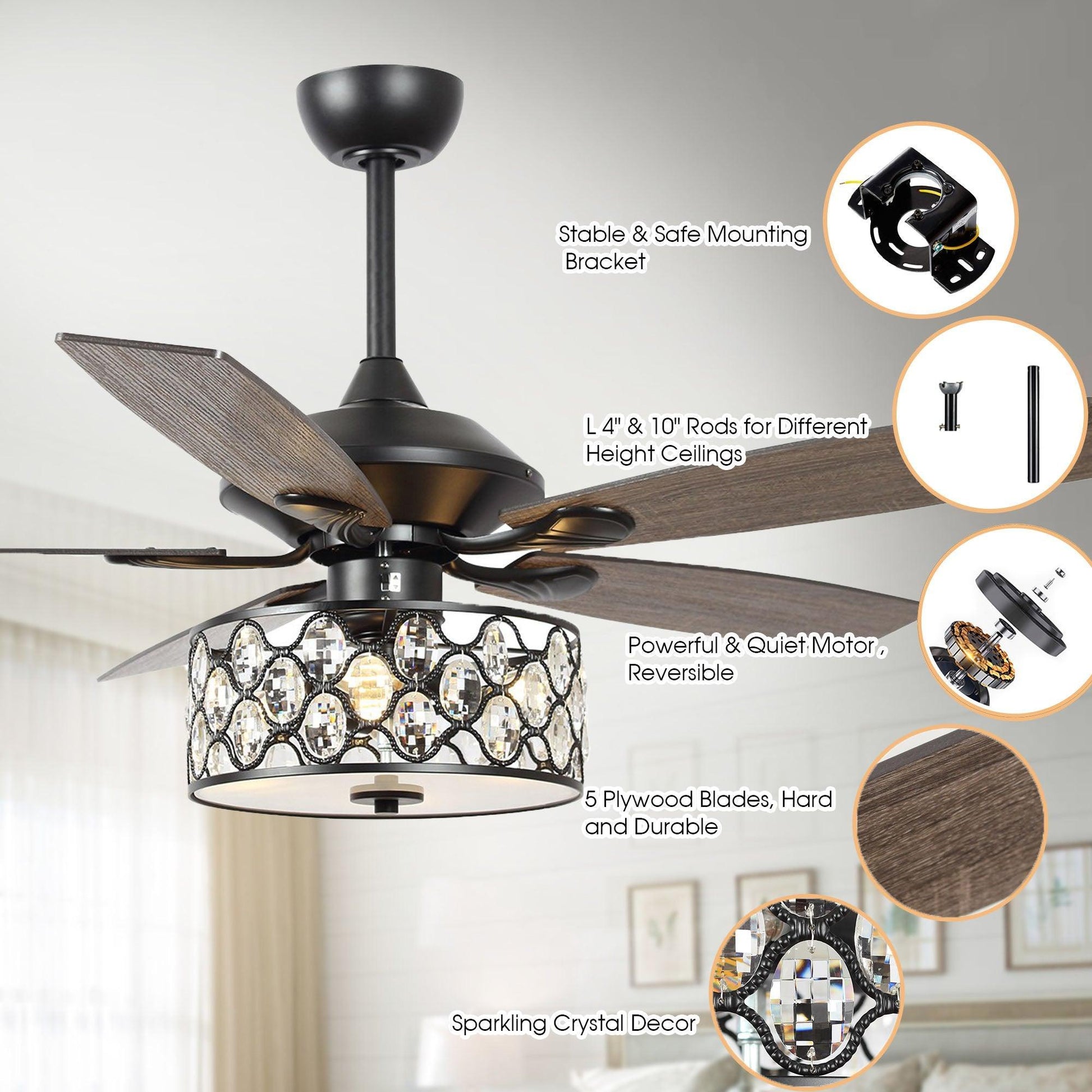 These ceiling fans are the most cost-efficient option for bringing the temperature down and moving stale air out of your room. This lighted chandelier ceiling fan is the perfect solution for your cooling and lighting needs. A full crystal shade combines to fill your home with a grandeur rarely found in such a functional package. The matching silver-stained wooden blades move an impressive amount of air. The 3-speed motor ensures you find the exact setting for your stimulating comfort.
