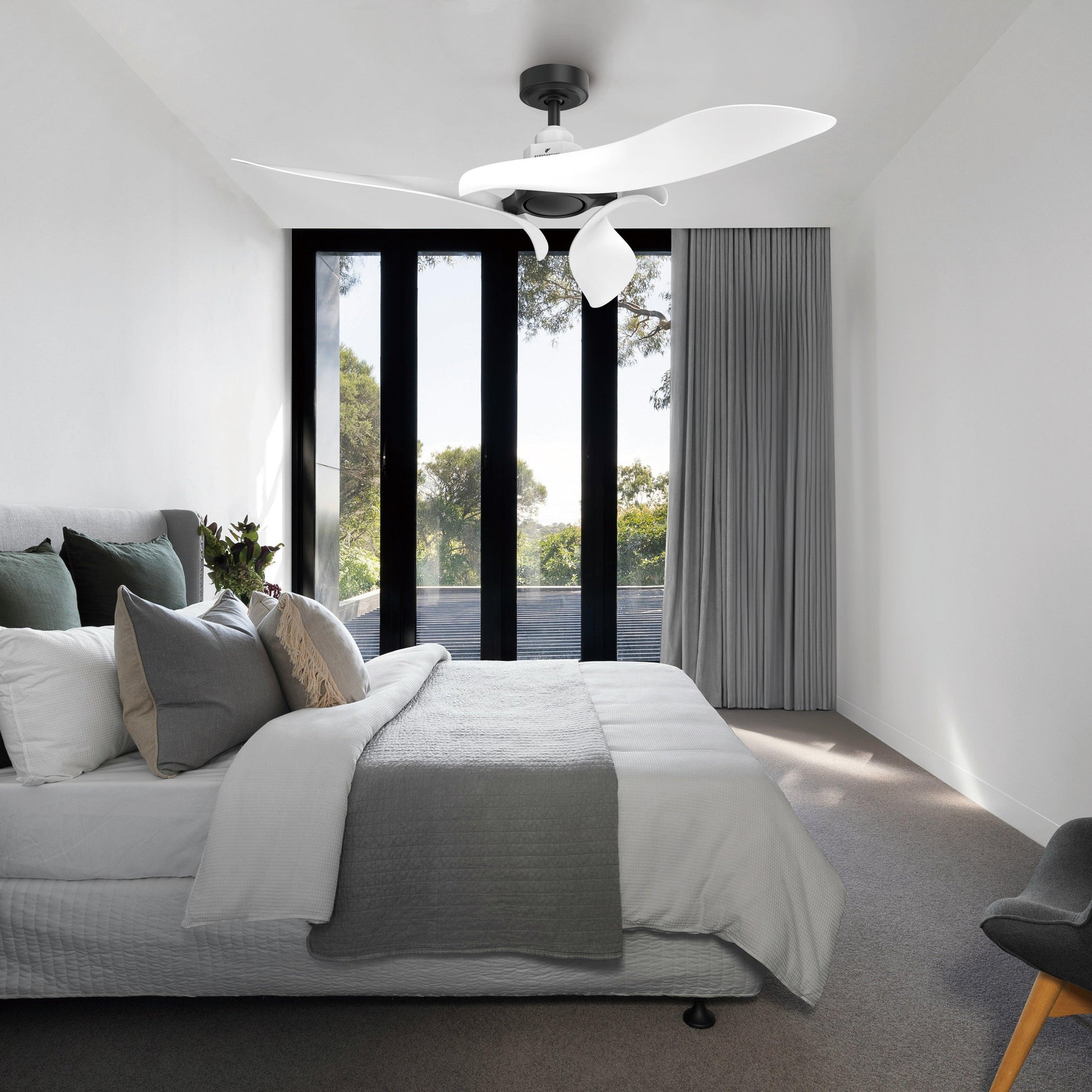 We love the clean lines and sharp angles of this 54'' black ceiling fan for its elegant, modern look. It has 3 reversible matte white blades and is made of ABS material. The blades are tilted at 20° for energy efficiency and optimal airflow, and the metal frame is equipped with a 6-speed motor. This ceiling fan can be used indoors in dry conditions, but it can also be safely used in wet areas like a covered porch or patio. The best part is that it's simple to operate with its convenient remote control.