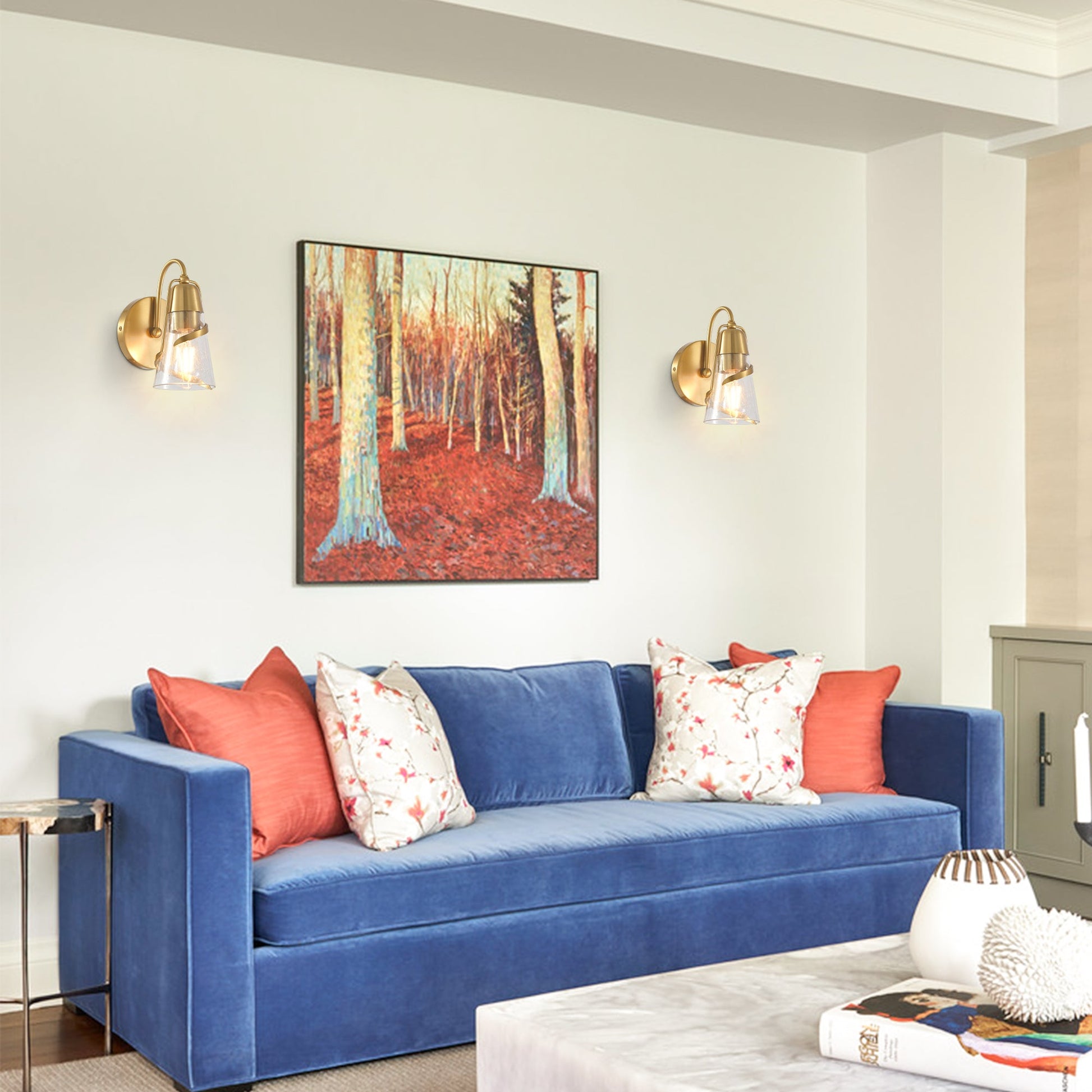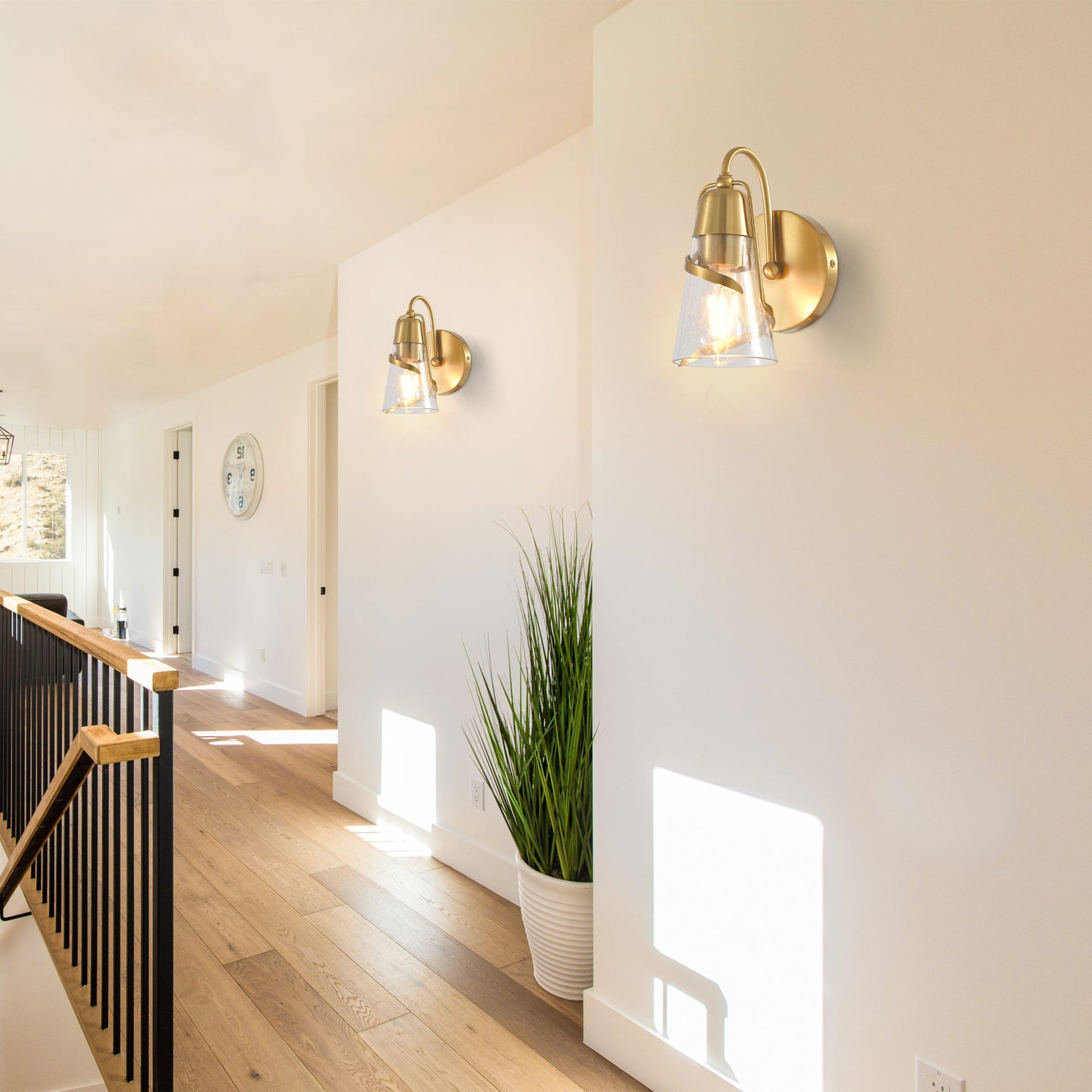 Add a touch of modern elegance to your bedroom, bathroom, or living room with this sleek golden vanity light, crafted from iron and glass.