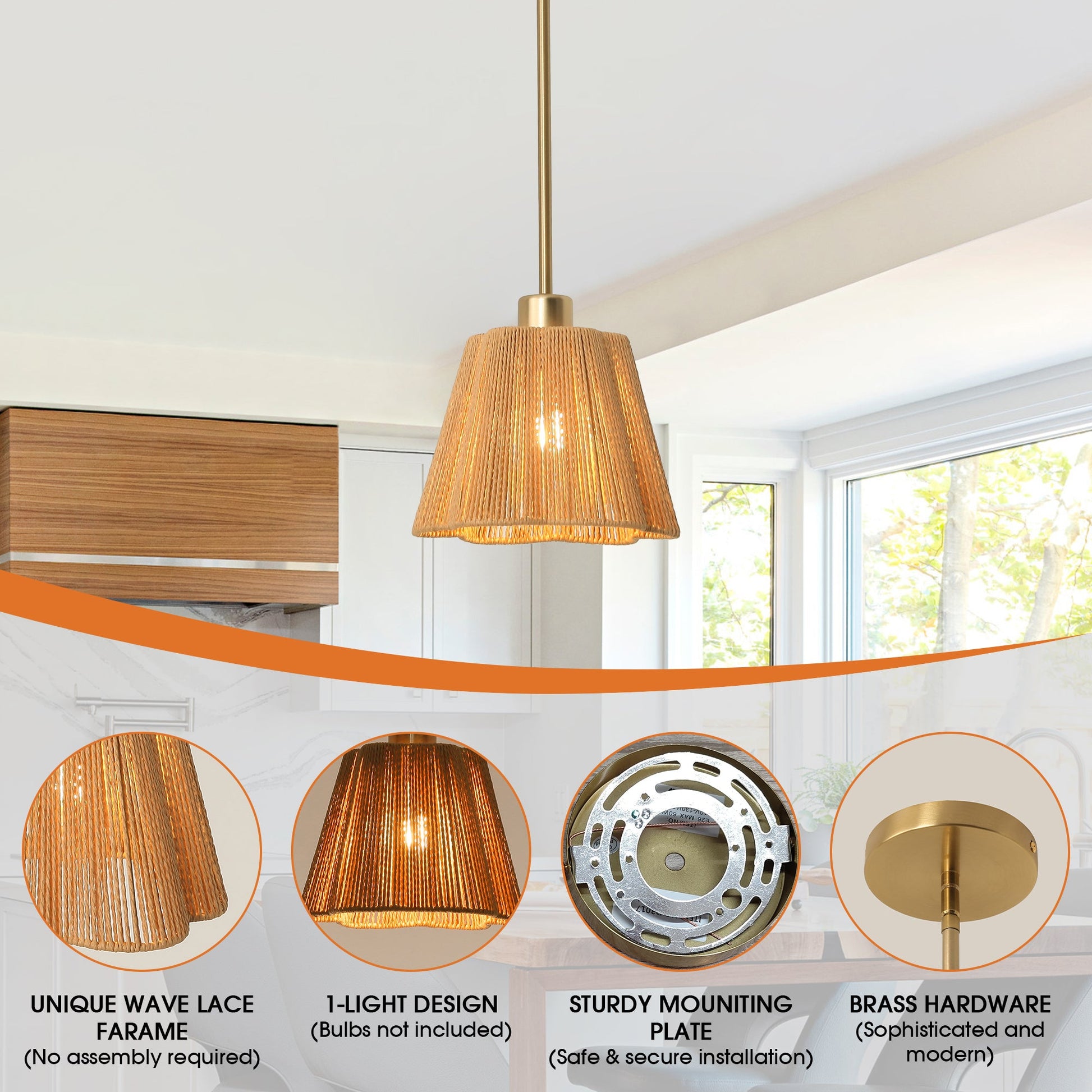 【Farmhouse Style】: Features a classic farmhouse design with a warm golden iron finish. Combines a durable iron frame with a natural woven hemp paper rope shade for rustic texture.