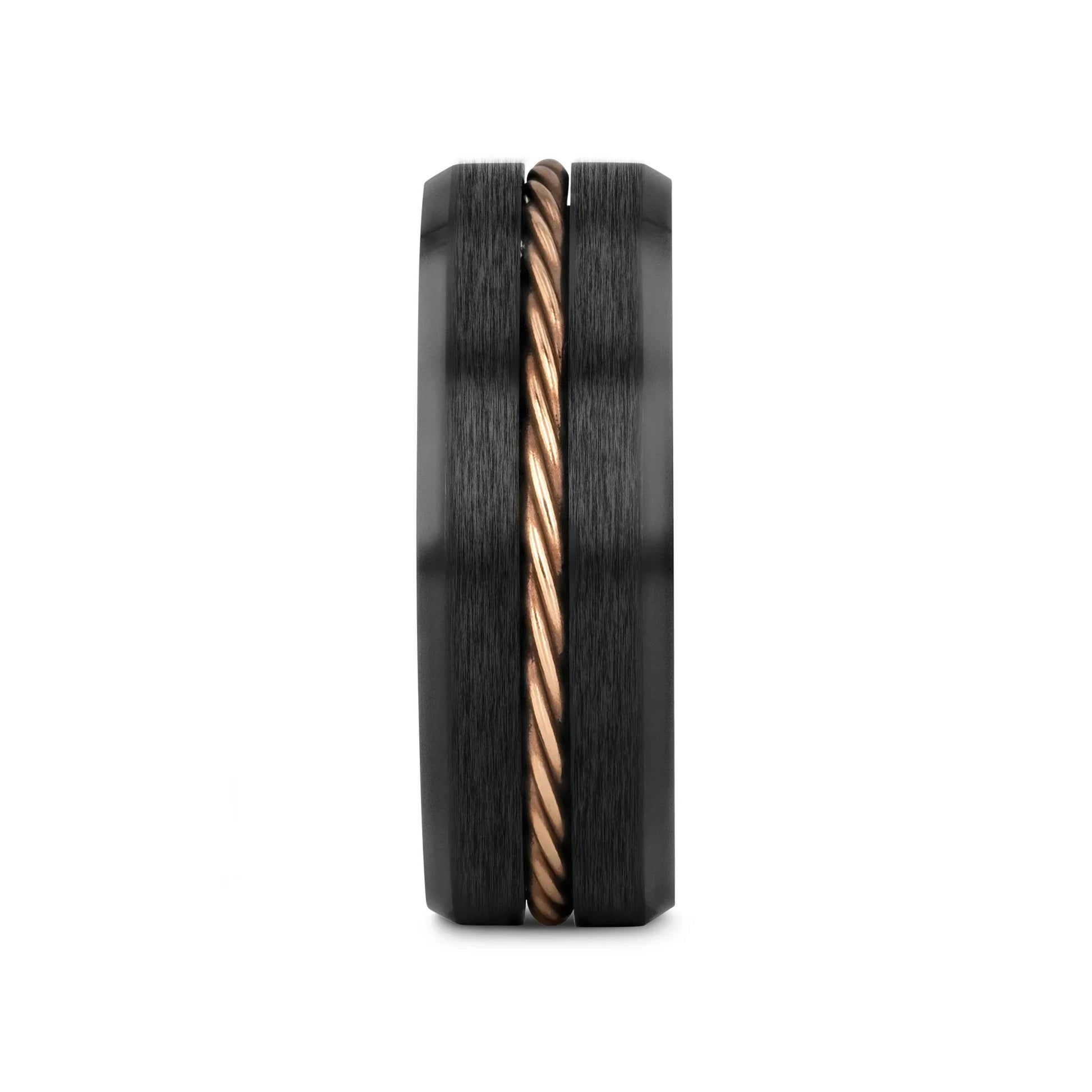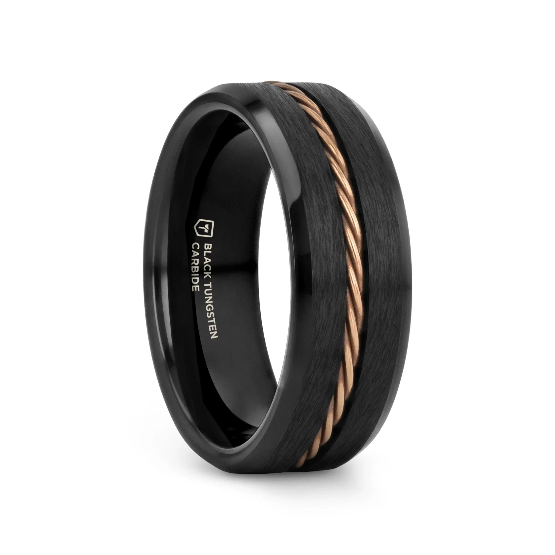 ADELARD Rose Gold Braided Cable Black Tungsten Men’s Wedding Band, Brushed Center with Polished Beveled Edges – 8mm
