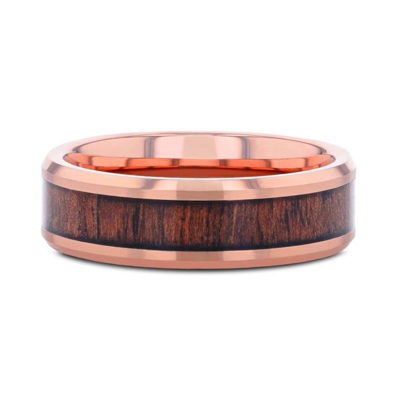 ALDER Rose Gold Plated Rosewood Inlaid Tungsten Men's Wedding Band With Beveled Polished Edges - 8mm
