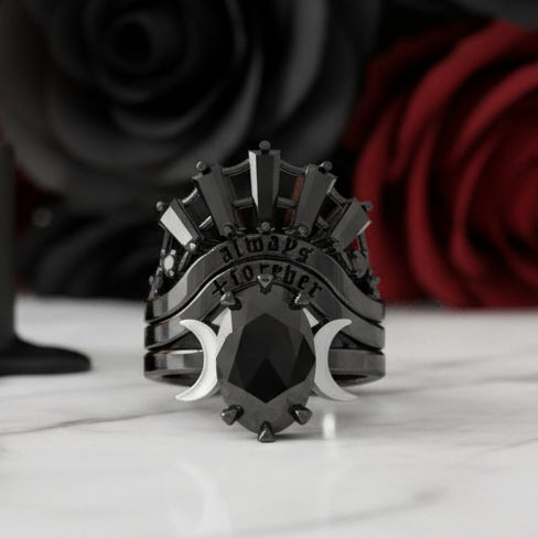 The Always and Forever Gothic Promise Rings feature a breathtaking oval cut black diamond set in radiant 14k rose gold, surrounded by intricate gothic detailing. Perfect for alternative brides and dark romance lovers, this gothic bridal set captures eternal devotion with an edge of mystery and passion.