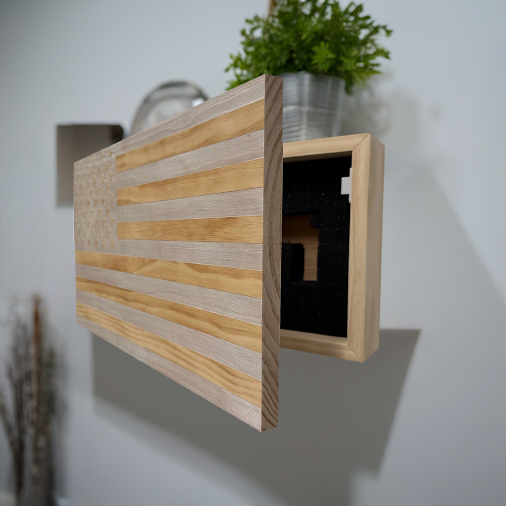 Securely store your gun and other home self defense gear inside the classic Bellewood Designs American Flag Patriotic Decorative Wall-Mounted Secure Gun Cabinet. The American Flag is engraved, hand painted and then finished with high gloss finish which is sure to make a statement in any room. Your firearm and other tactical gear is easily accessible yet securely stored, so you'll never have to worry about leaving it unattended.