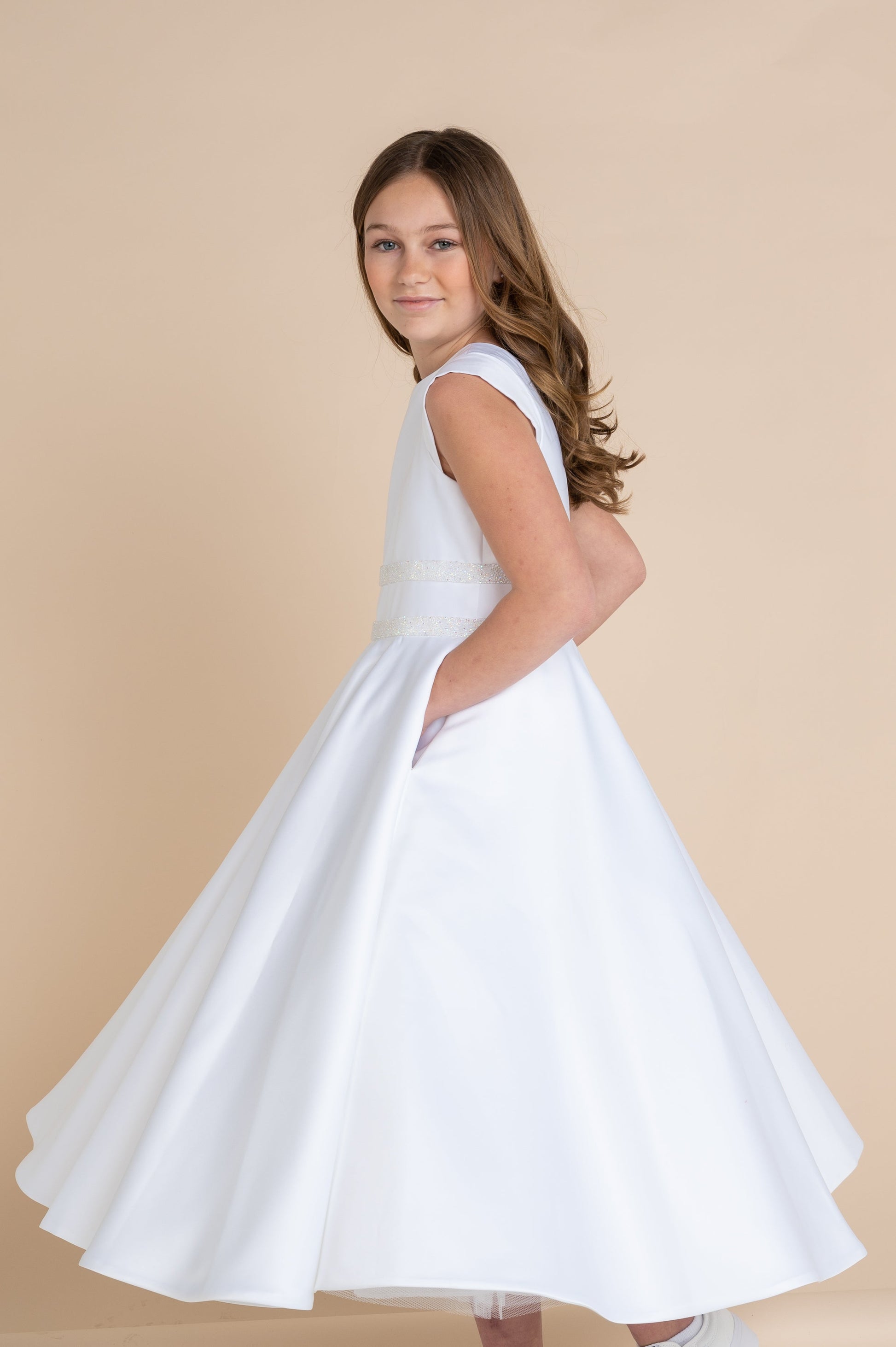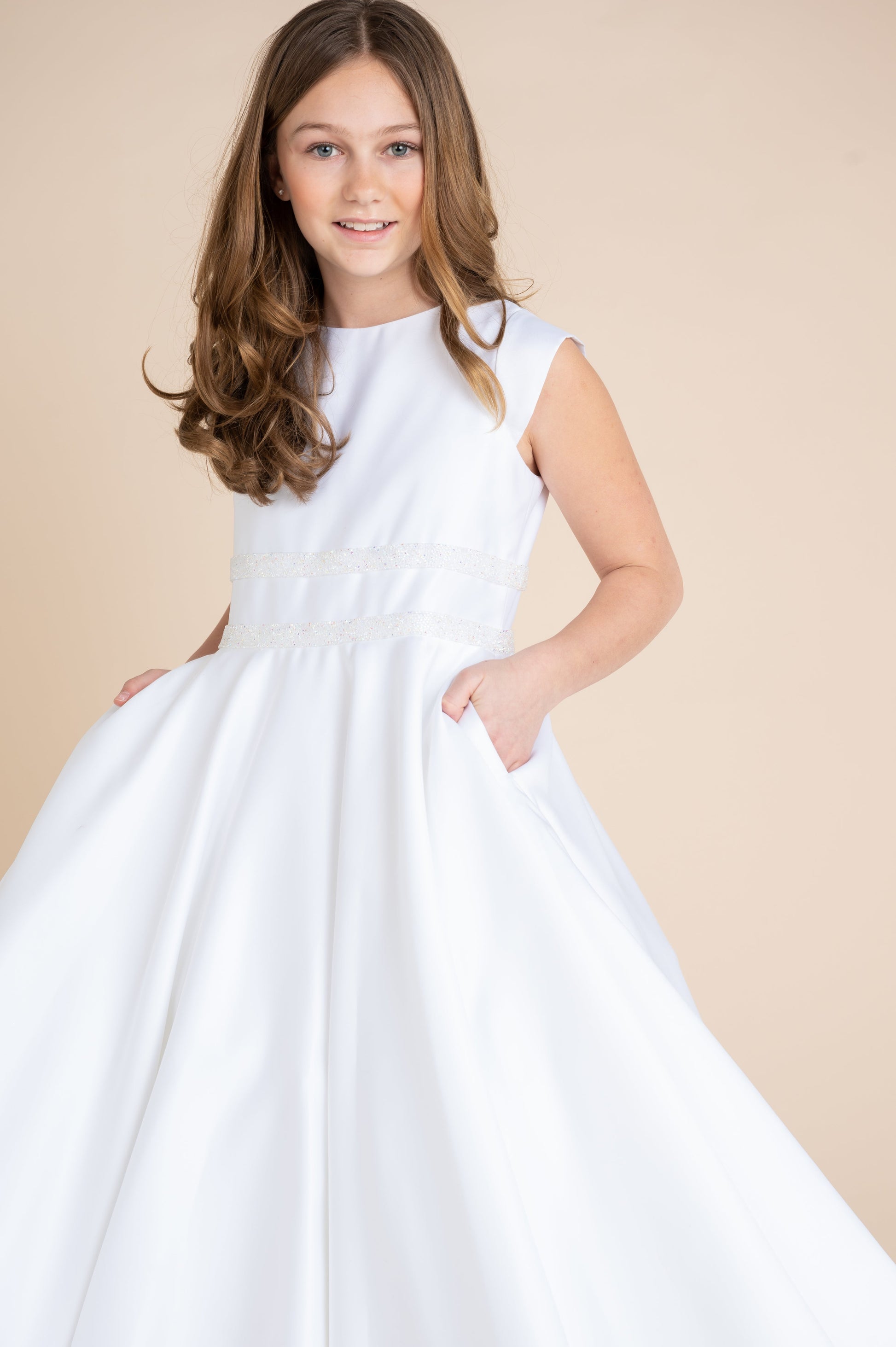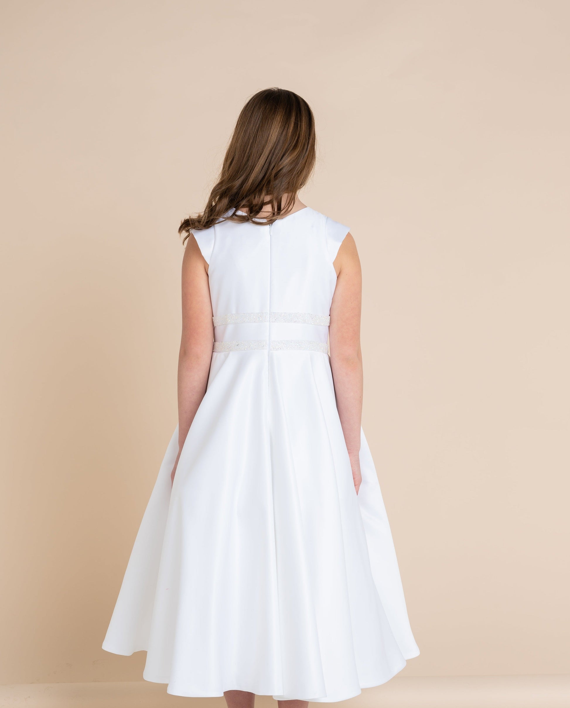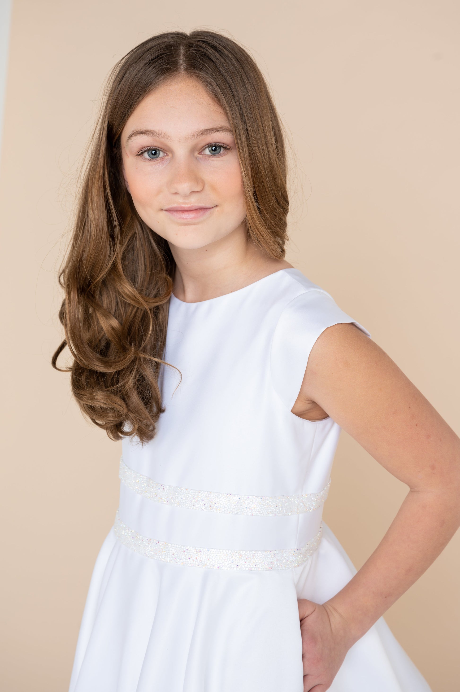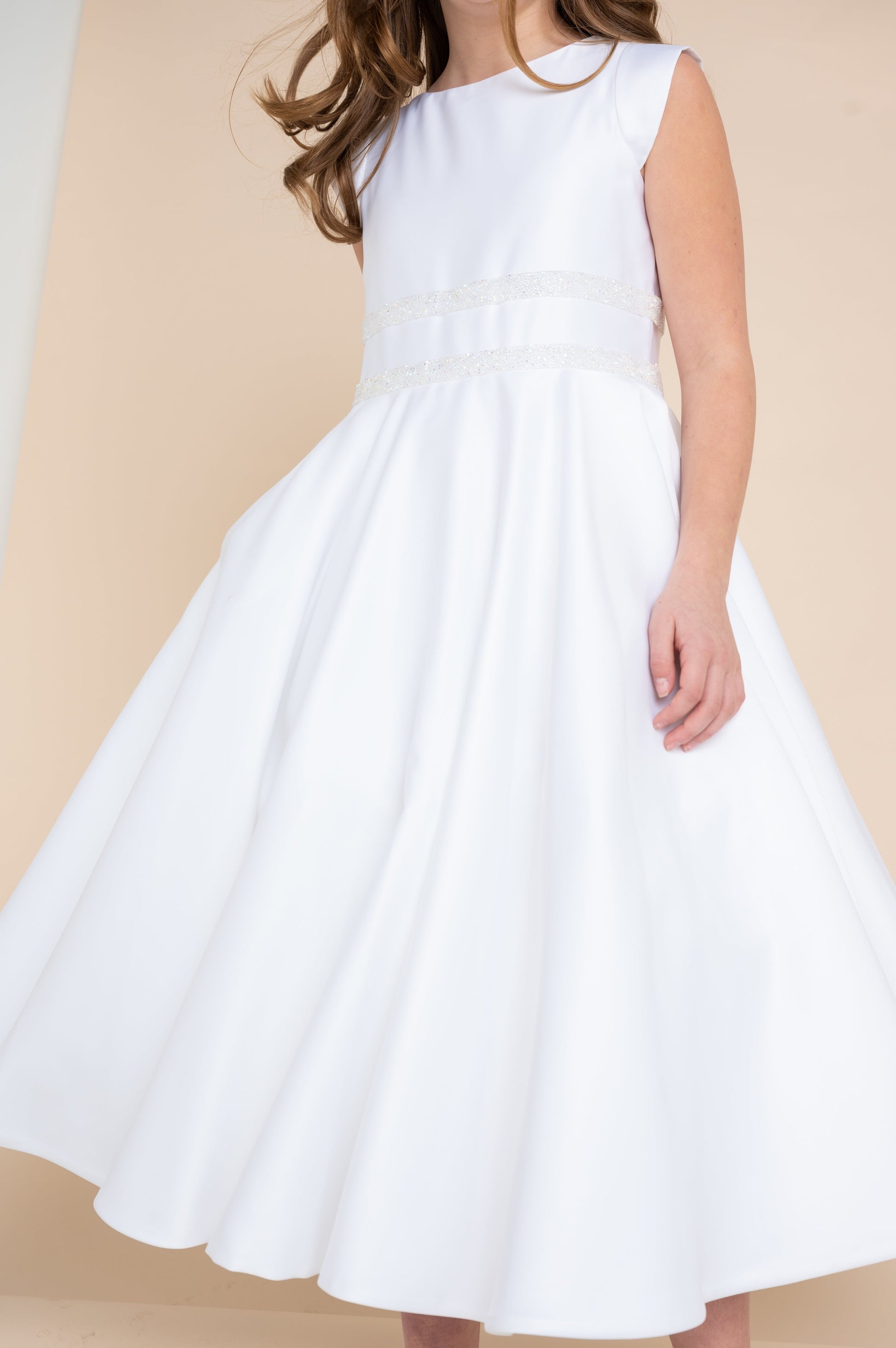 - Anastasia dress featuring matte sateen dress with double crystal belt and cap sleeves.