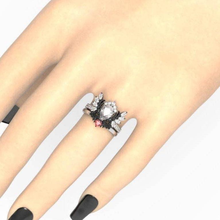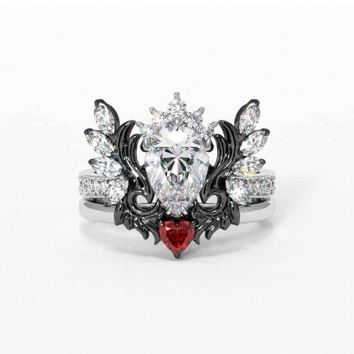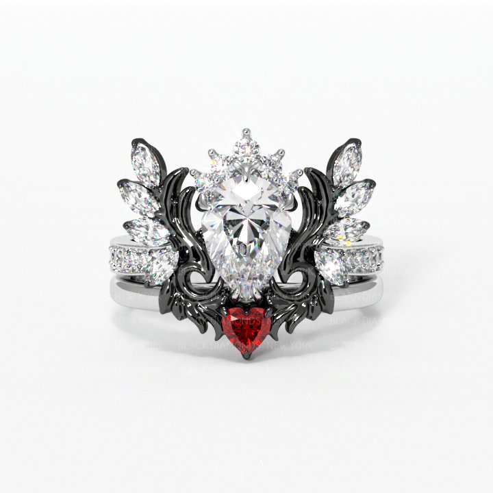 Angel's Wings- 14k White Gold Pear Cut and Red Heart Diamond Gothic Promise Ring