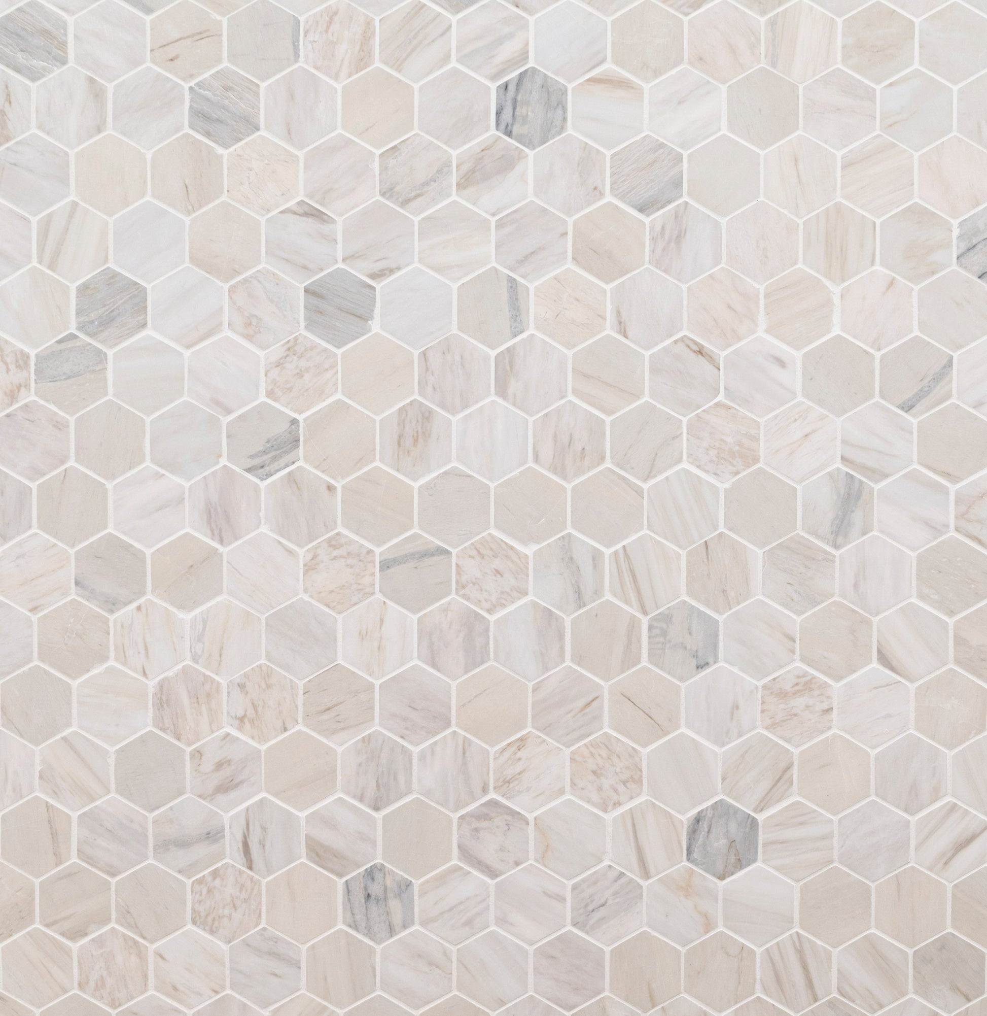 Add warm elegance to your space with Angora Polished 2” Hexagon Mosaic Tile. A fresh take on the classic hexagon shape, this tile is suitable for various wall applications, and floor applications in residential settings. Featuring a medley of beige, grey, and creamy hues, the neutral palette of this genuine marble tile is perfect for your kitchen backsplash, fireplace facade, shower surround, bathroom vanity wall and more. Not only stylish, but also durable and low maintenance, Angora Polished 2” Hexagon Mosaic Tile updates your space with the beauty of natural marble. Tiles are strategically arranged on mesh backed sheets for simplified installation and professional look.
