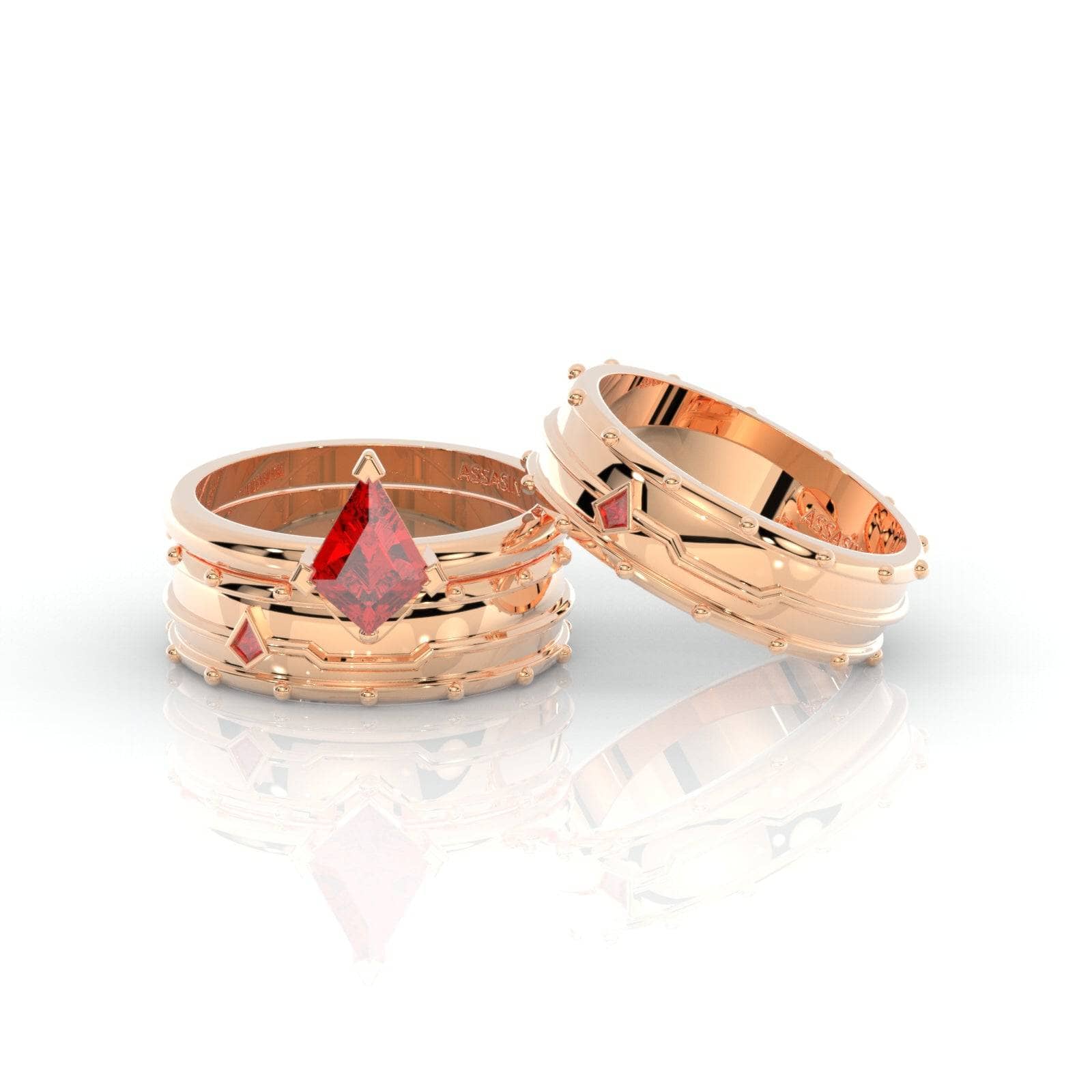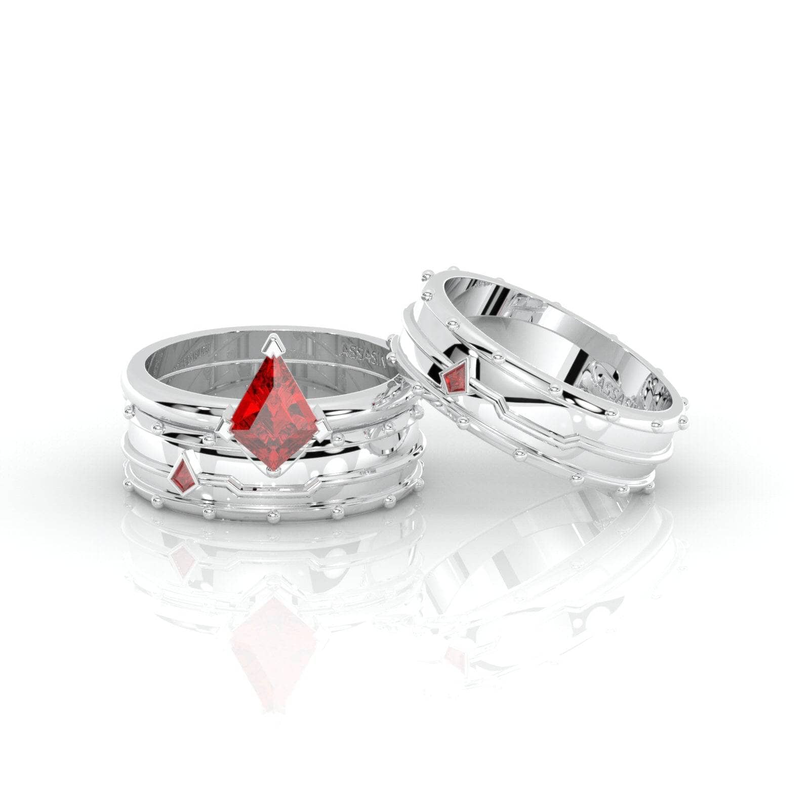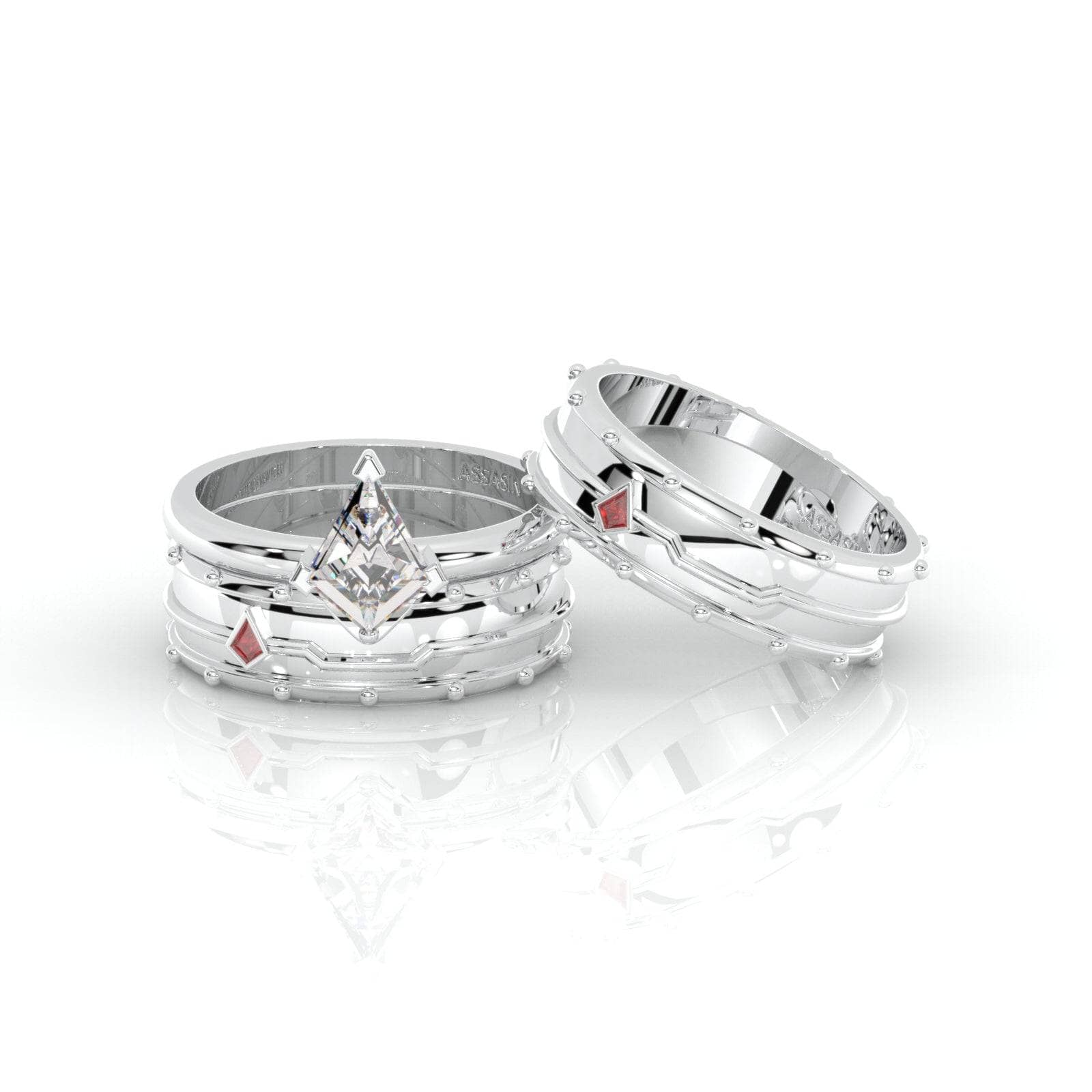 Ever wonder what your favorite assassin character would look like in a fine ring? Stop wondering! These two-piece rings were meticulously designed to capture every Assasin gamer's dream. While you take your oath seriously to follow the truth and create peace and order, we handcrafted a unique 2-piece ring set to help you unlock your love story. This beautiful ring set screams fierce, magic, and power. Handcrafted with our custom-cut arrow-head shape diamonds to guide you and help you slay every day!