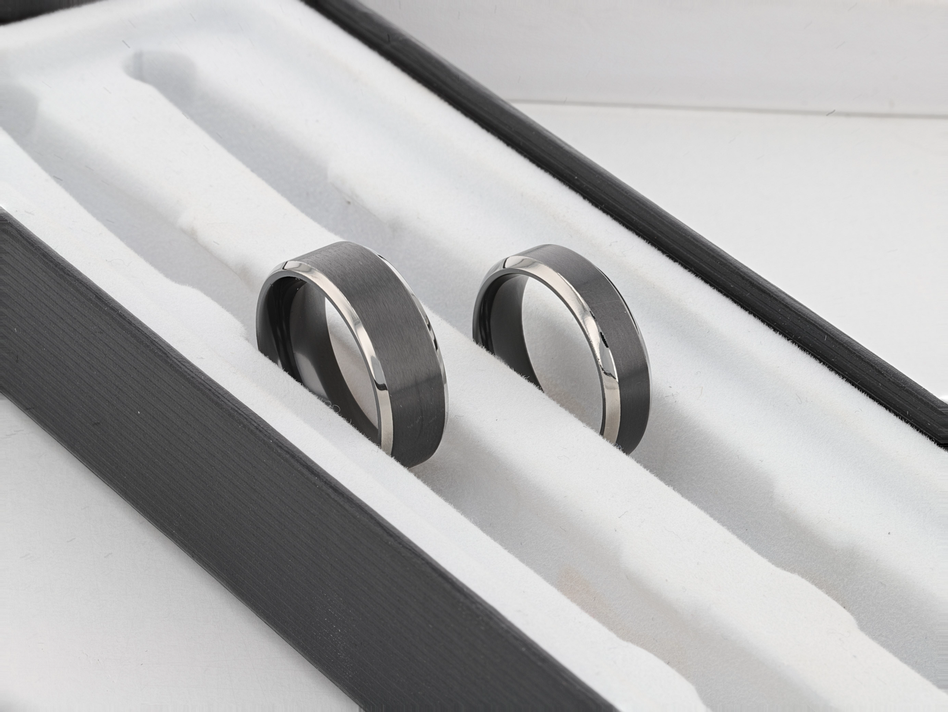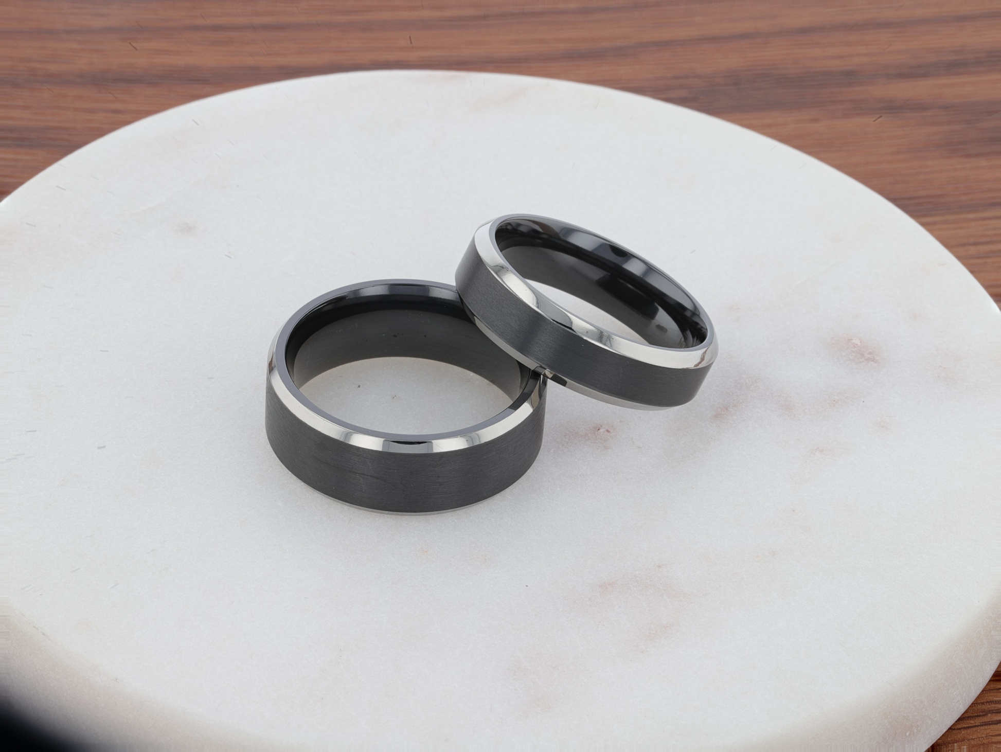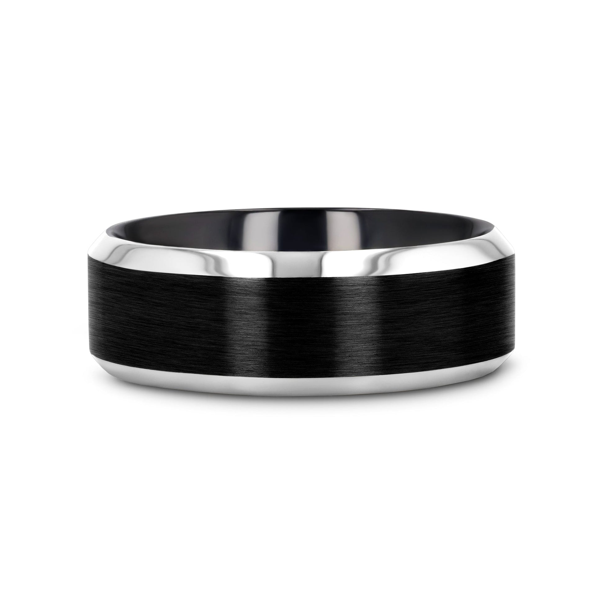 ATNOS Men’s Black Titanium Wedding Ring with Brushed Center and Polished Beveled Edges — 6mm & 8mm