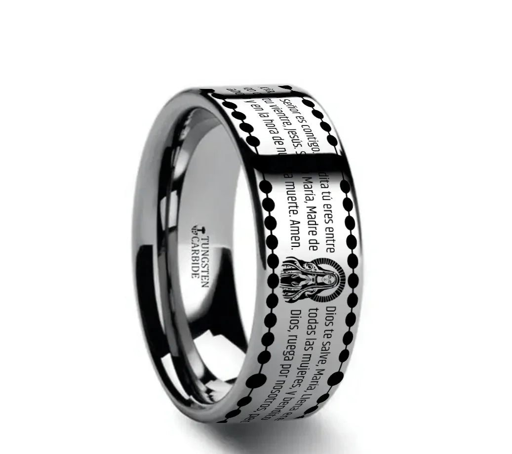 Presentamos el Anillo de Carburo de Tungsteno Ave María Lleva este hermoso anillo como un testimonio de tu fe y devoción.