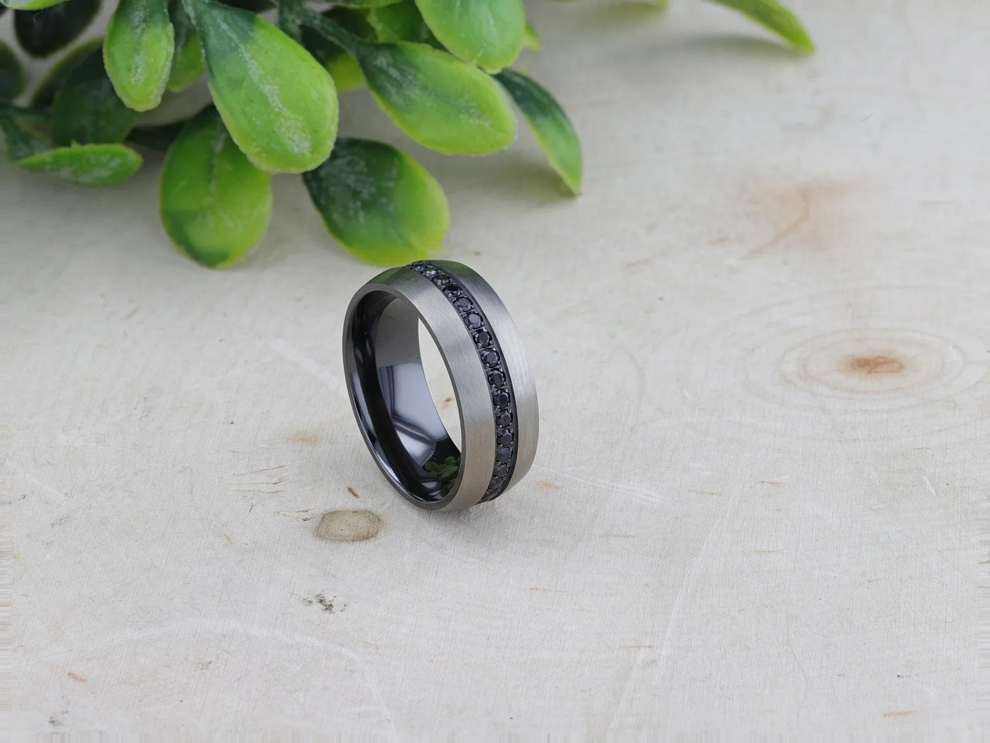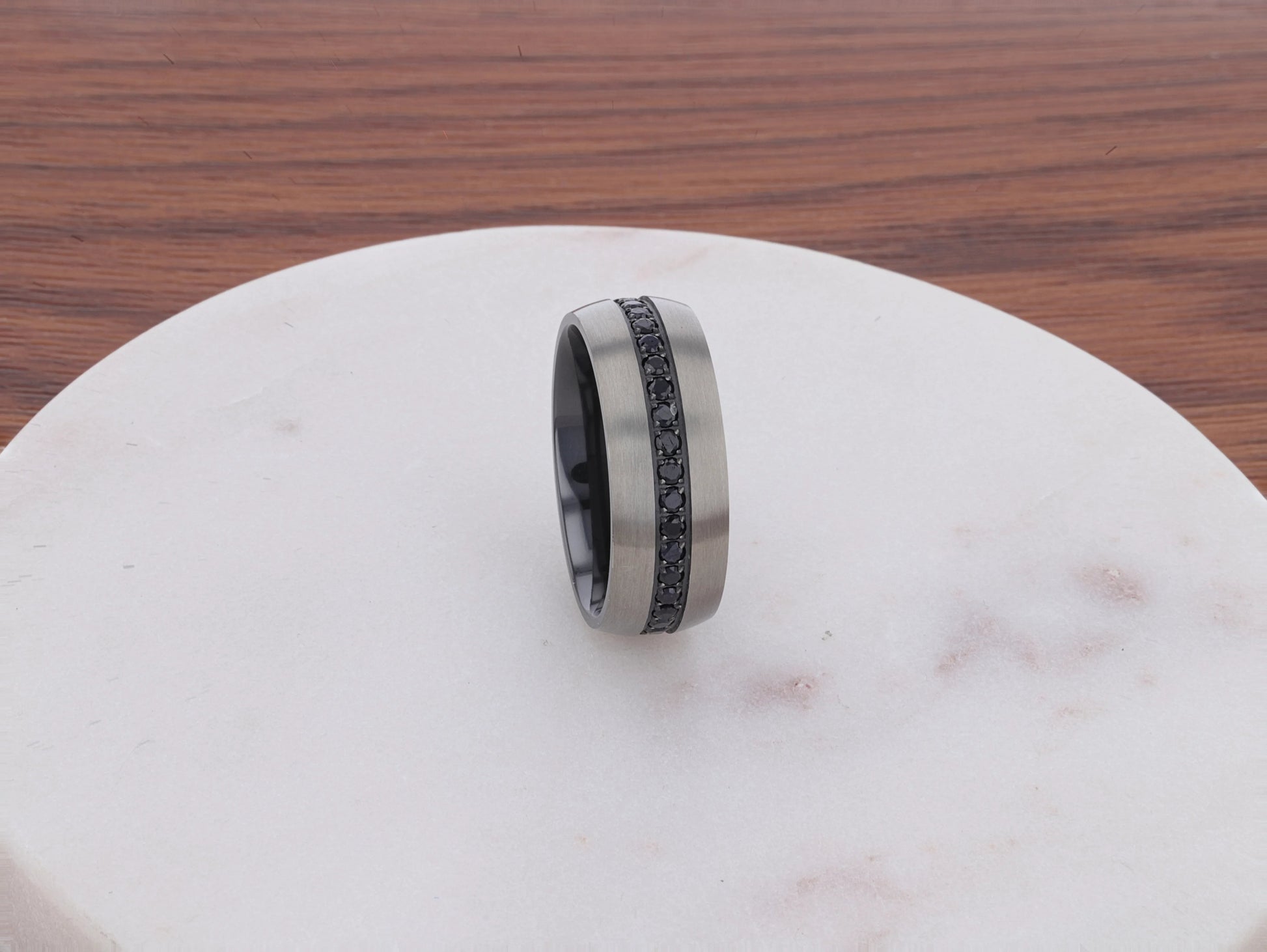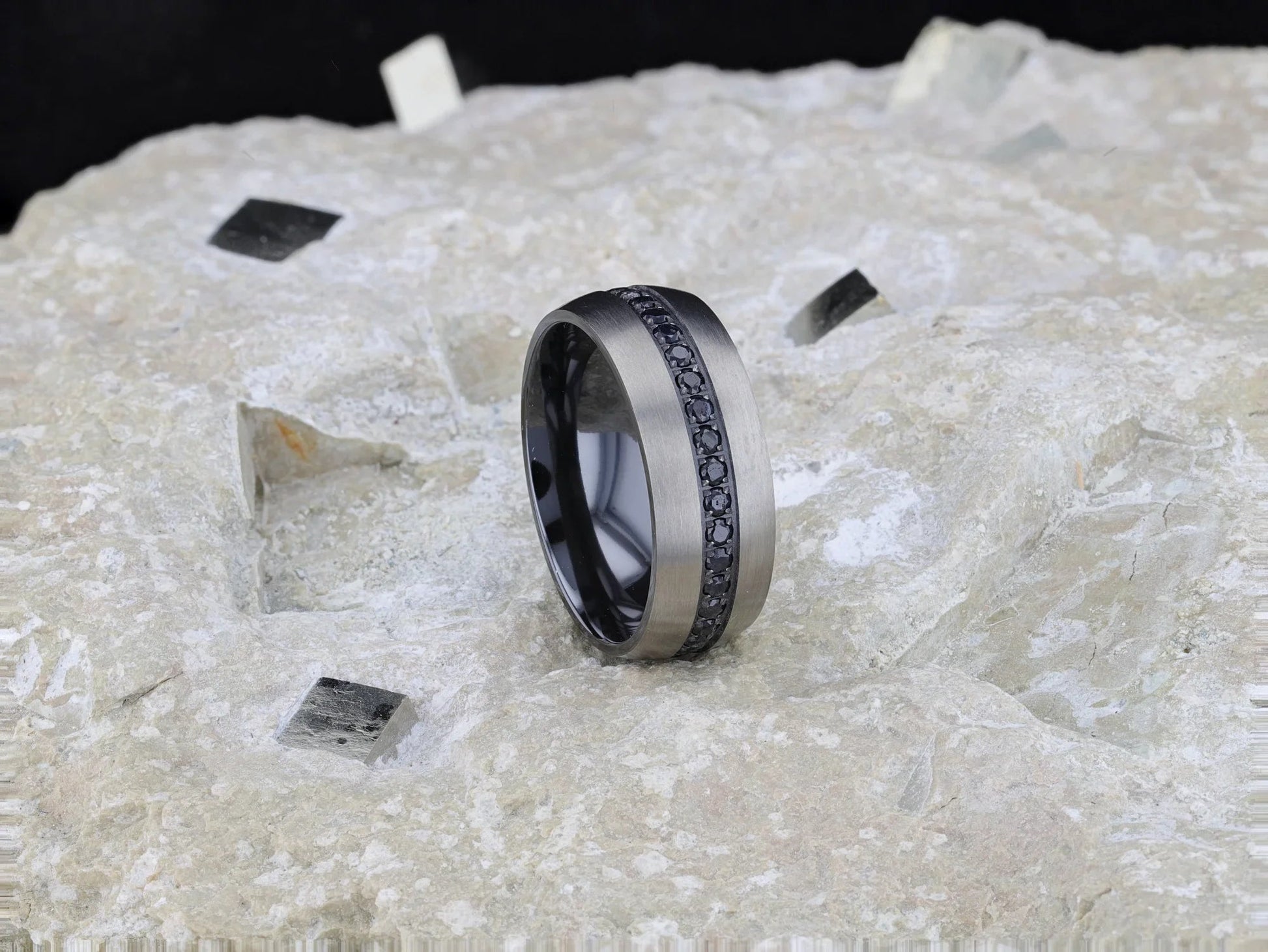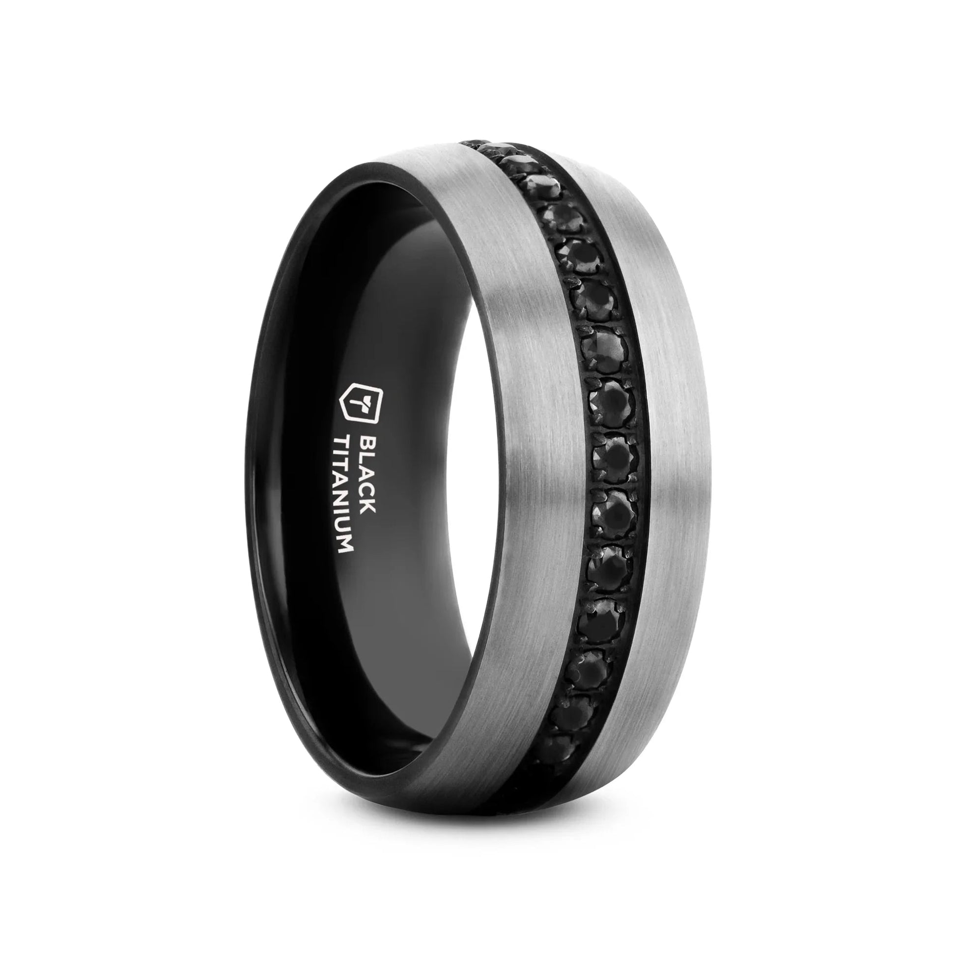 AVIATOR Domed Brushed Titanium Men's Wedding Band with Black Sapphire Stones Inlay - 8mm