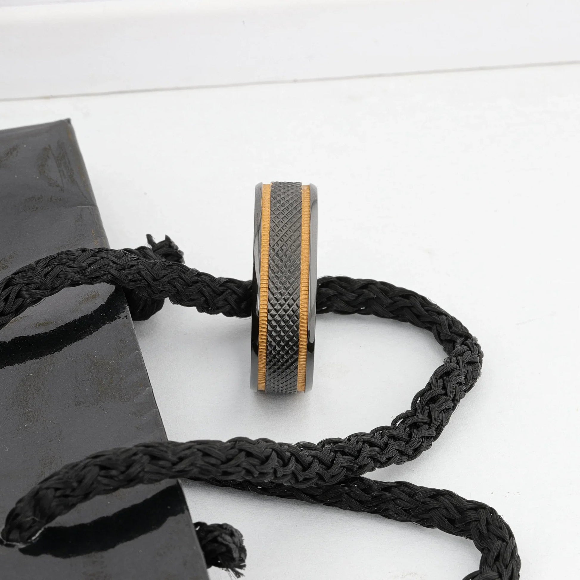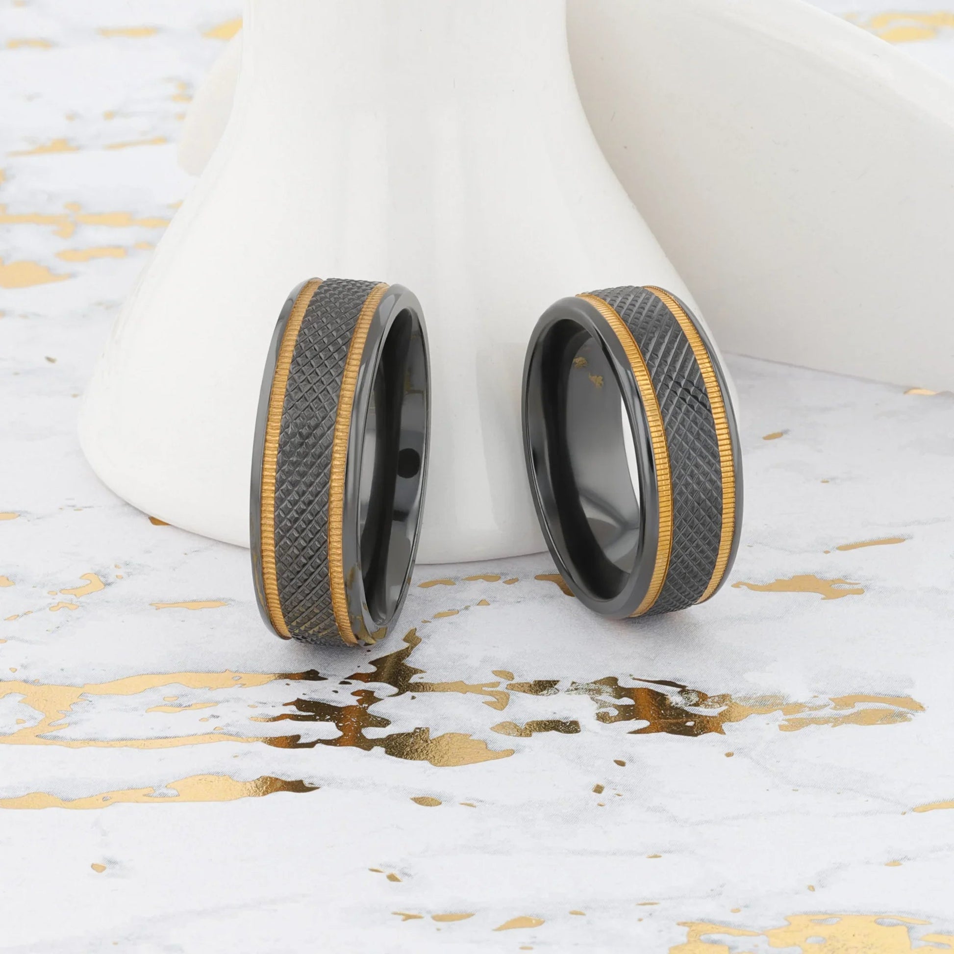BAROQUE Black Titanium Diamond Pattern Brushed Finish Men’s Wedding Ring with Gold Milgrain Grooves – 8mm