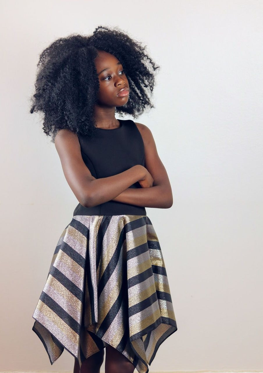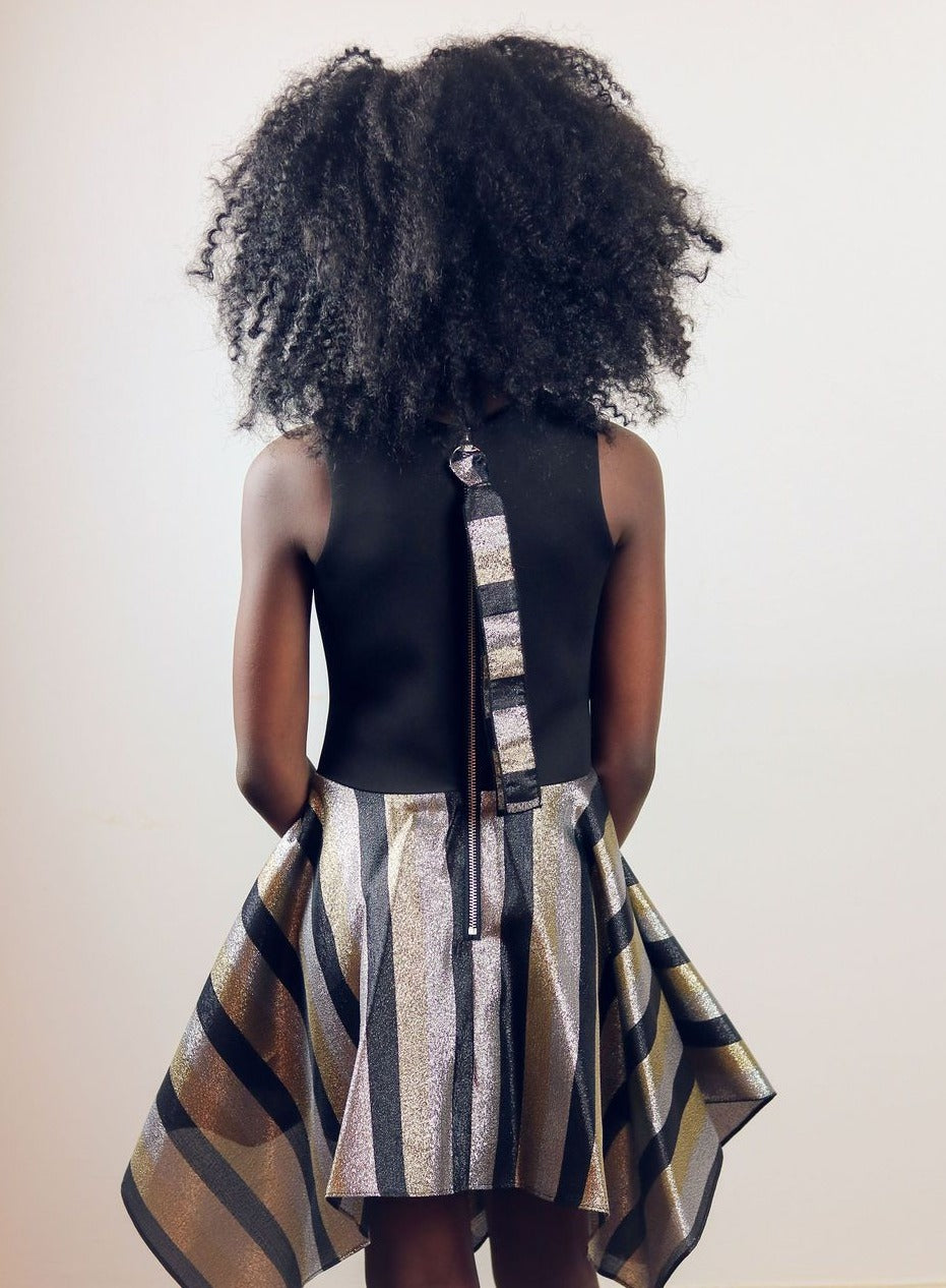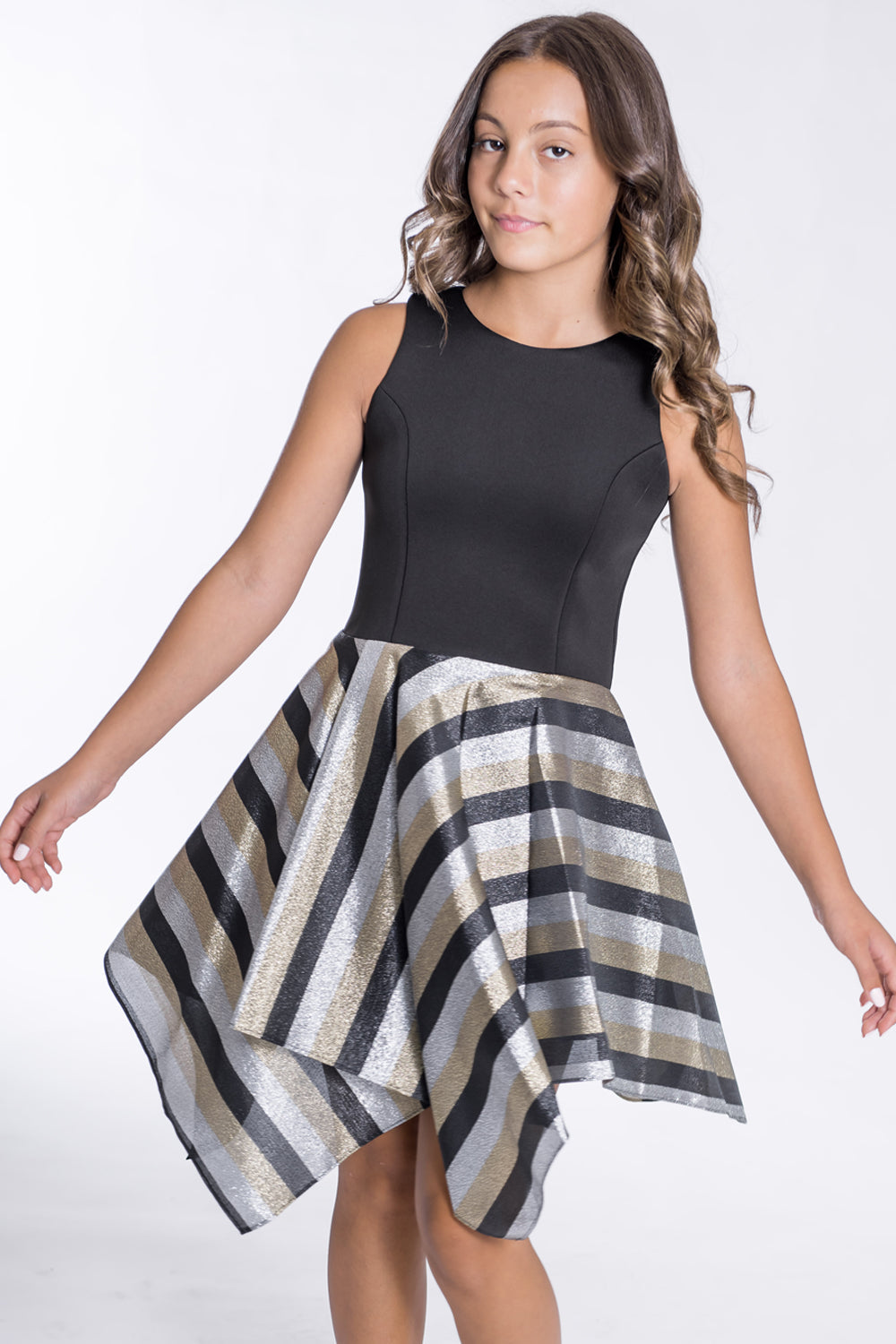 - Zoe "Bayadere" dress with solid bodice and stripe skirt.