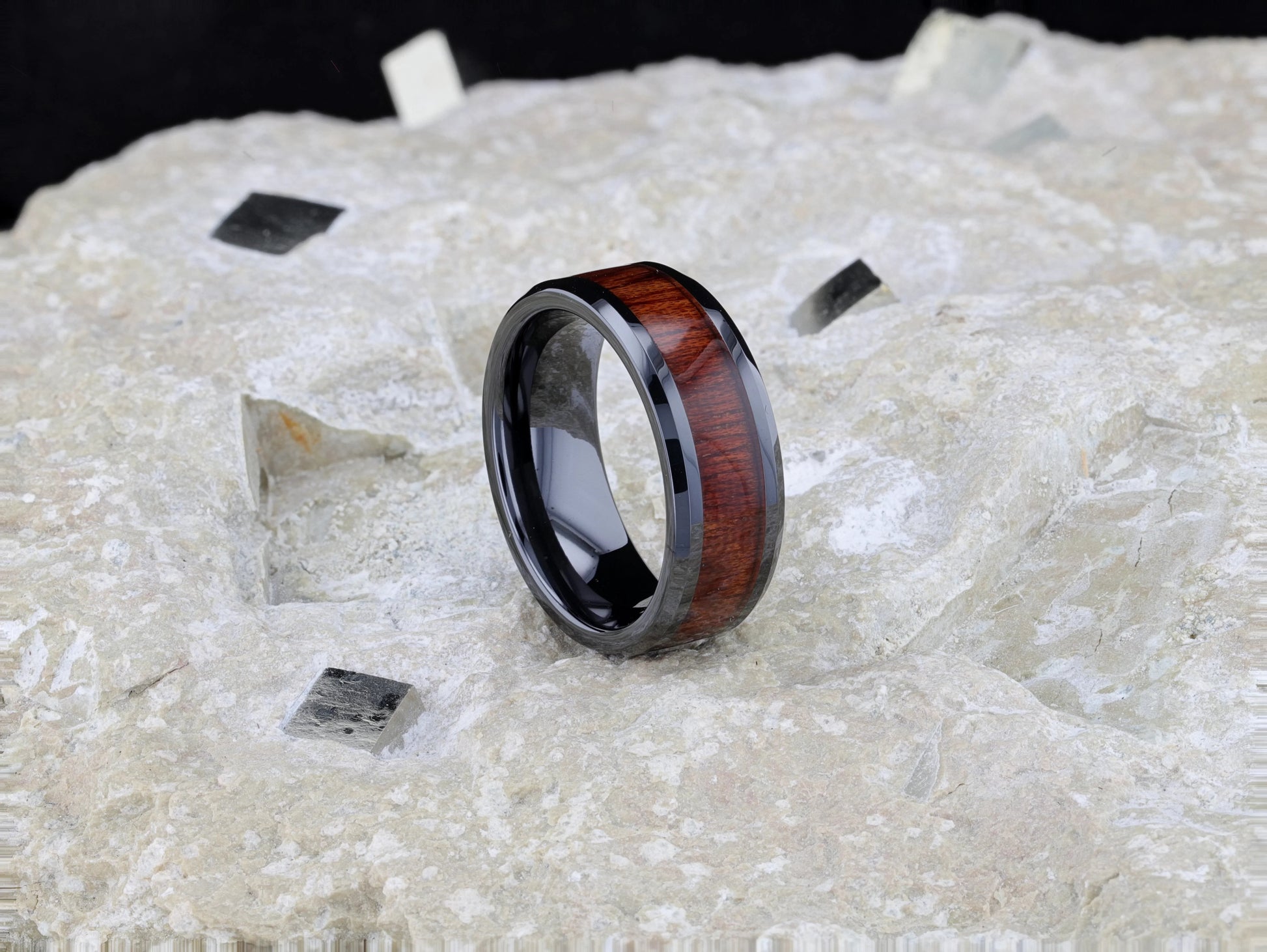 BENNY Black Ceramic Polished Beveled Edges Men’s Wedding Band with Bubinga Wood Inlay - 8mm