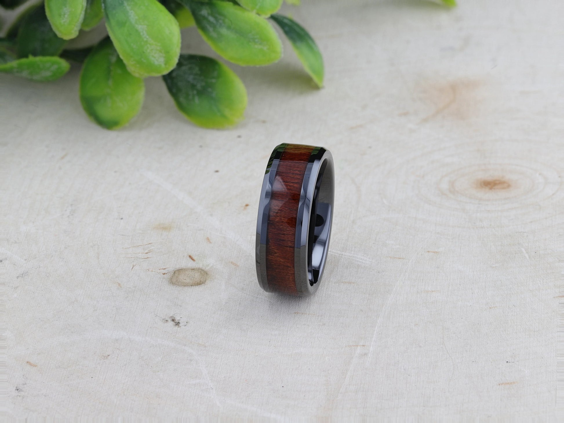 Bubinga wood inlay highlights the center of this masculine wedding band for men. Bubinga has a beautiful dark reddish-brown color. This black ceramic band is made with beveled edges and a flat profile that adds a modern touch.