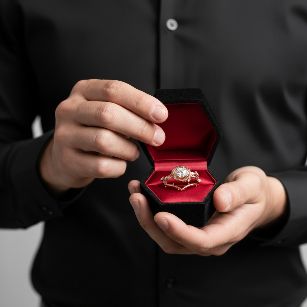 A stunning gothic engagement ring featuring a .50ct round-cut diamond nestled in a sculpted black rose design, crafted in 14k black gold. Delicate moissanite leaves frame the center stone, creating an edgy yet elegant look. Perfect for those who love dark romance and alternative style.