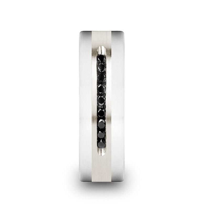 BLACKSTONE Flat Tungsten Wedding Band with Brushed Silver Inlay Center and 9 Channel Set Black Diamonds - 8mm