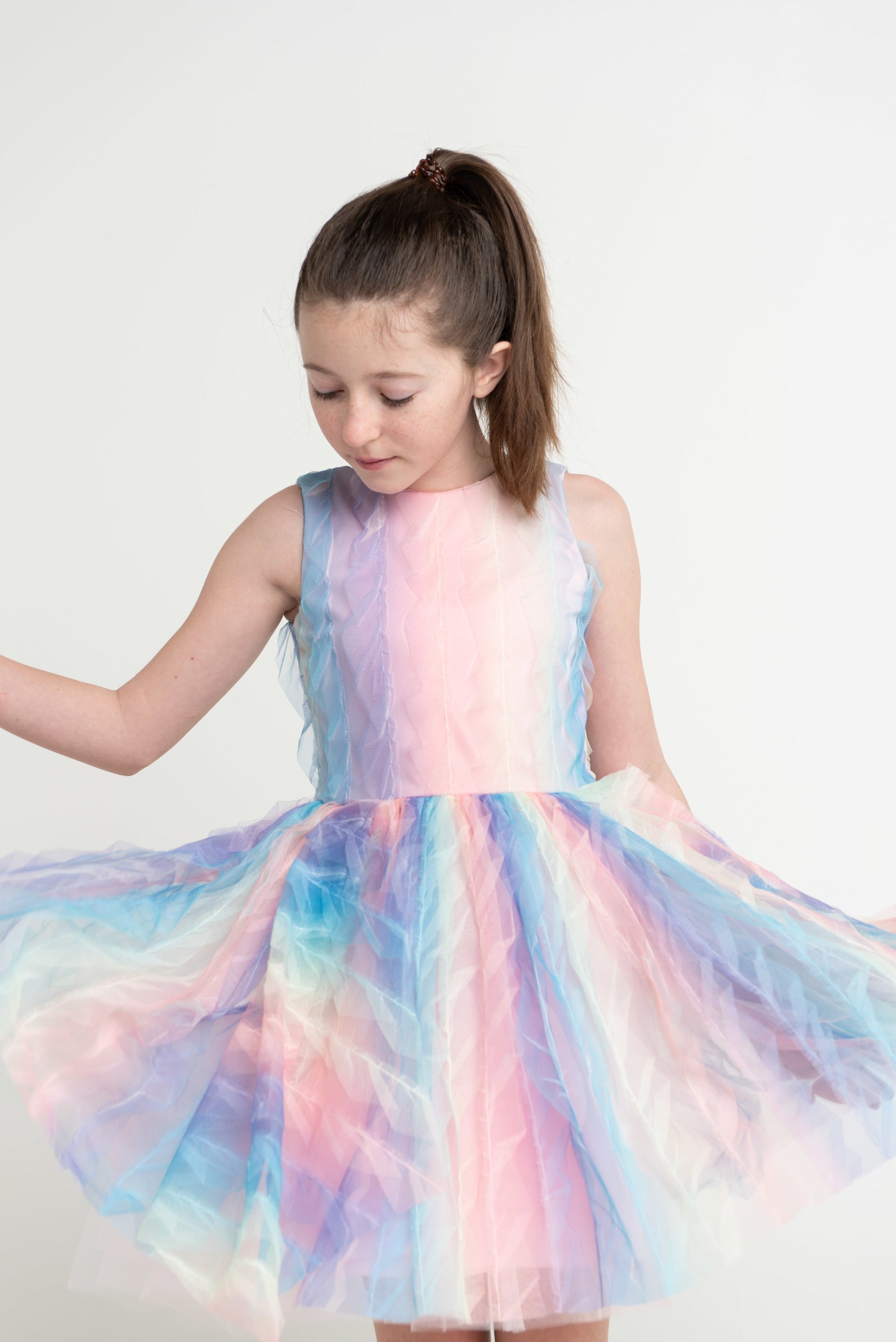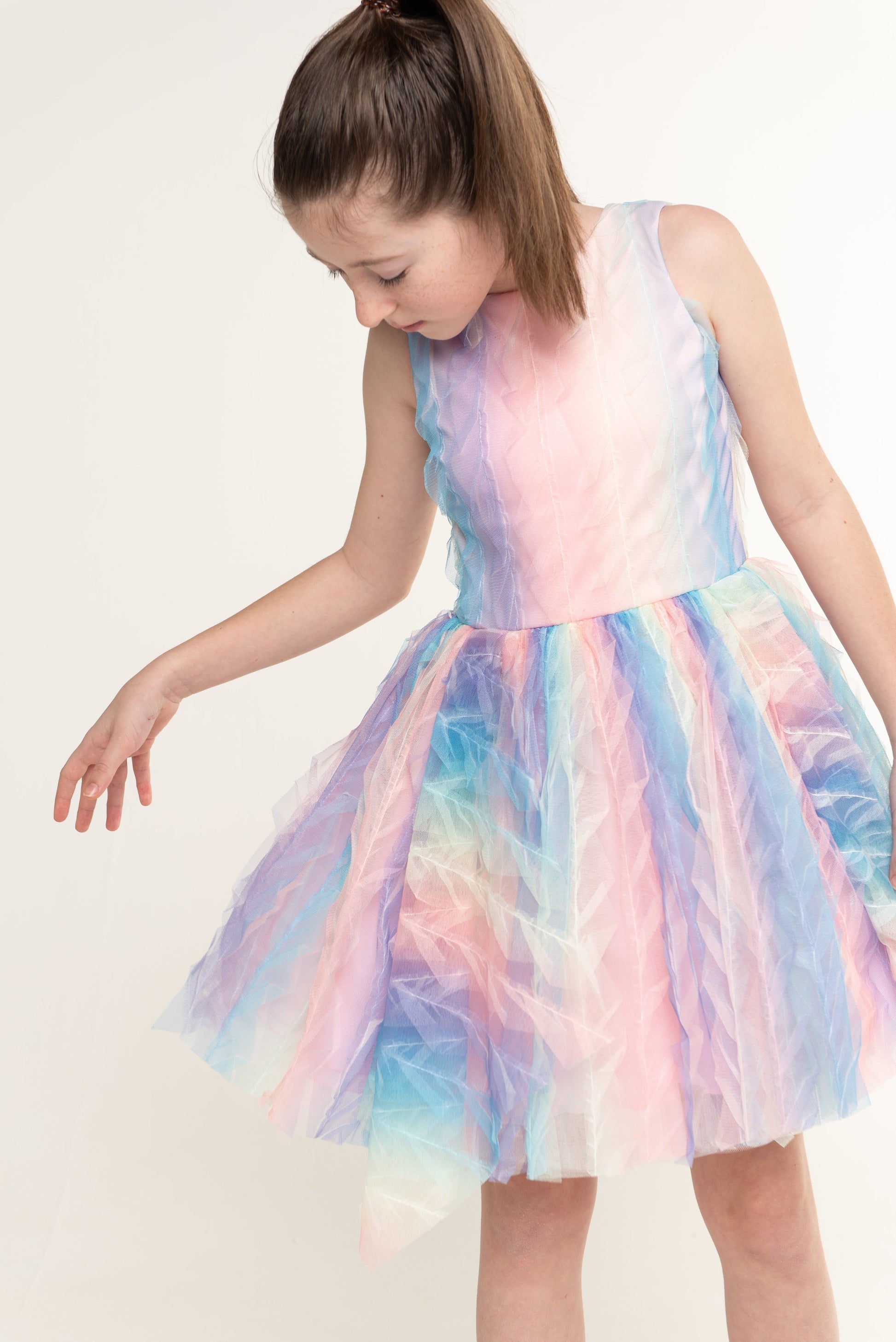 Exquisitely ruffled dress in rainbow print with asymmetrical layered panels adding dimension.