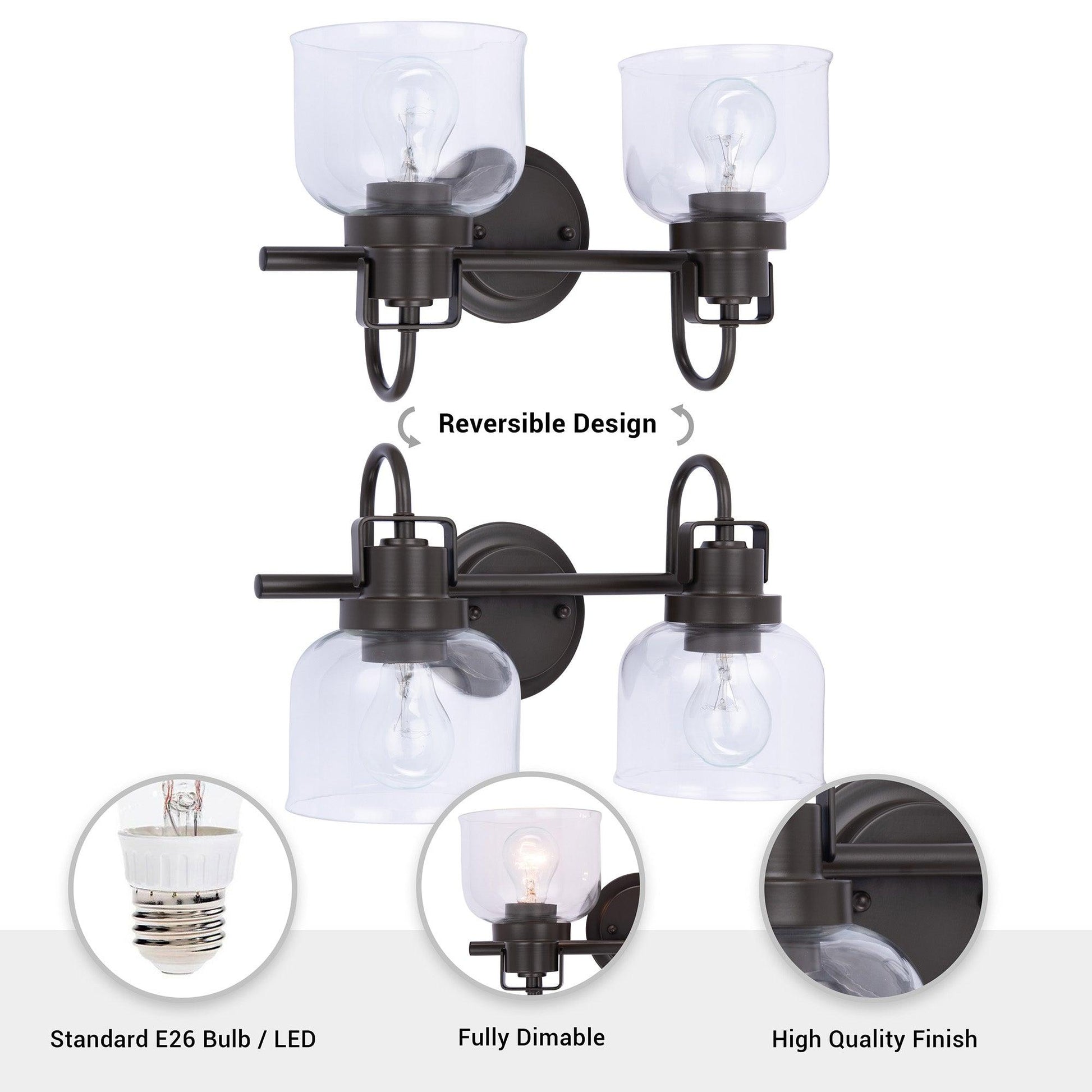 Dark Bronze, 2-light vanity light displays a modern farm house look for the vanity. The backplate connects to one sleek arm that can easily be mounted up or down thanks to its reversible feature. Two clear glass cups enclose two medium-base bulbs up to 60W, which is not included. This vanity light is compatible with a dimmer switch (not included), so you can adjust the lighting to match what the room requires.